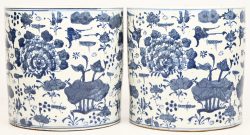 #397Een paar blauw-witte Chinees porseleinen cachepots met bloemdecor.
