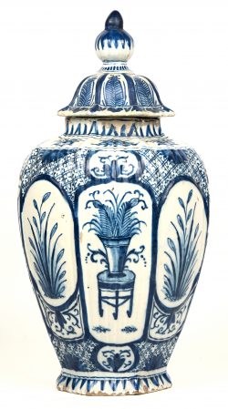 Vase couvert en faïence à décor Louis XV de plantes en niches. Delft, XVIIIe siècle. Usure des bords et restauration ancienne eau bord supérieur et au couvercle. Marqué en bas. -