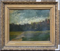 #299Period: 1905‘Zomers landschap’, olieverfstudie op karton. Onleesbaar getekend.