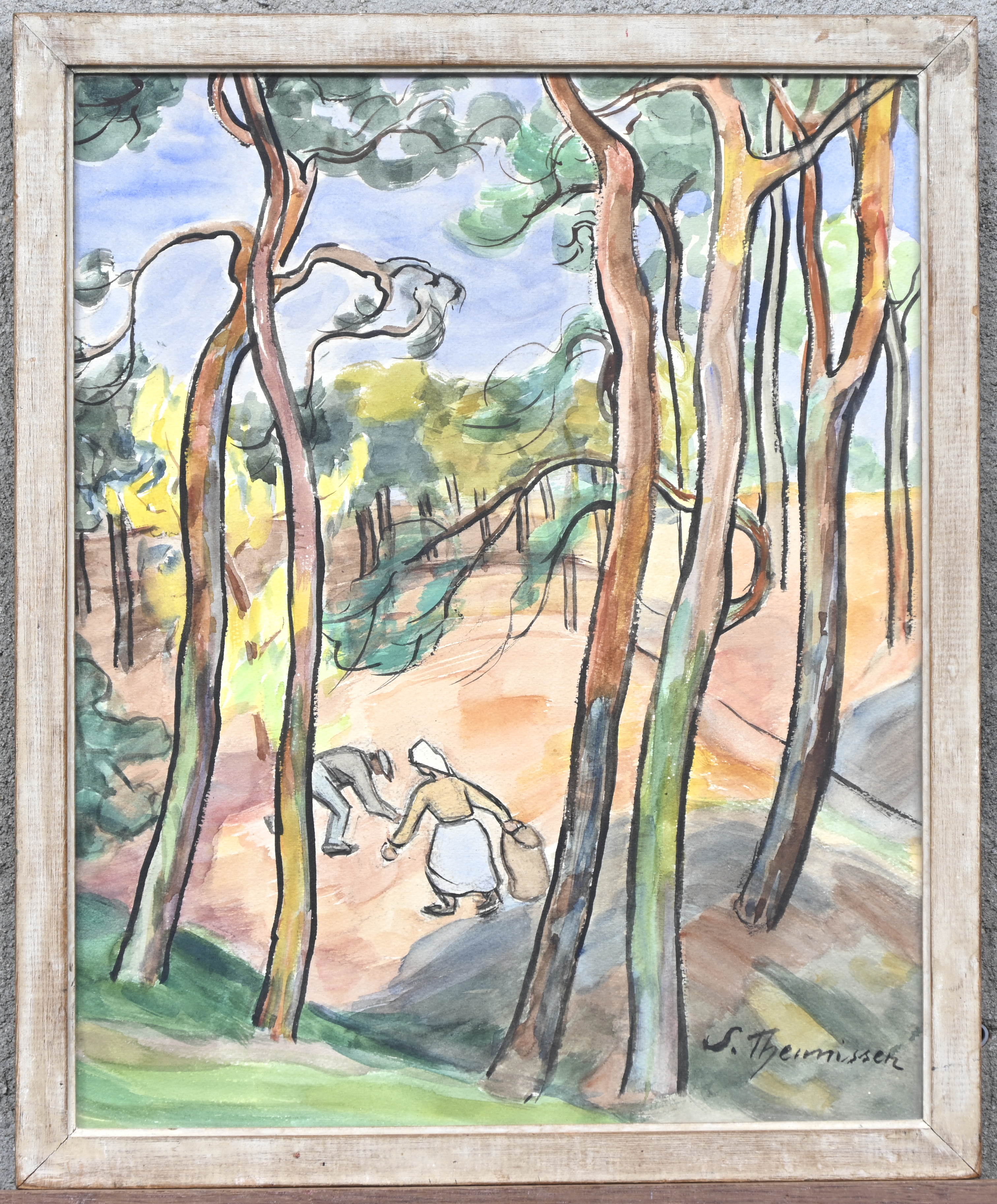 “Woodland View with Figures.” A study in watercolor, signed S. Theunissen.