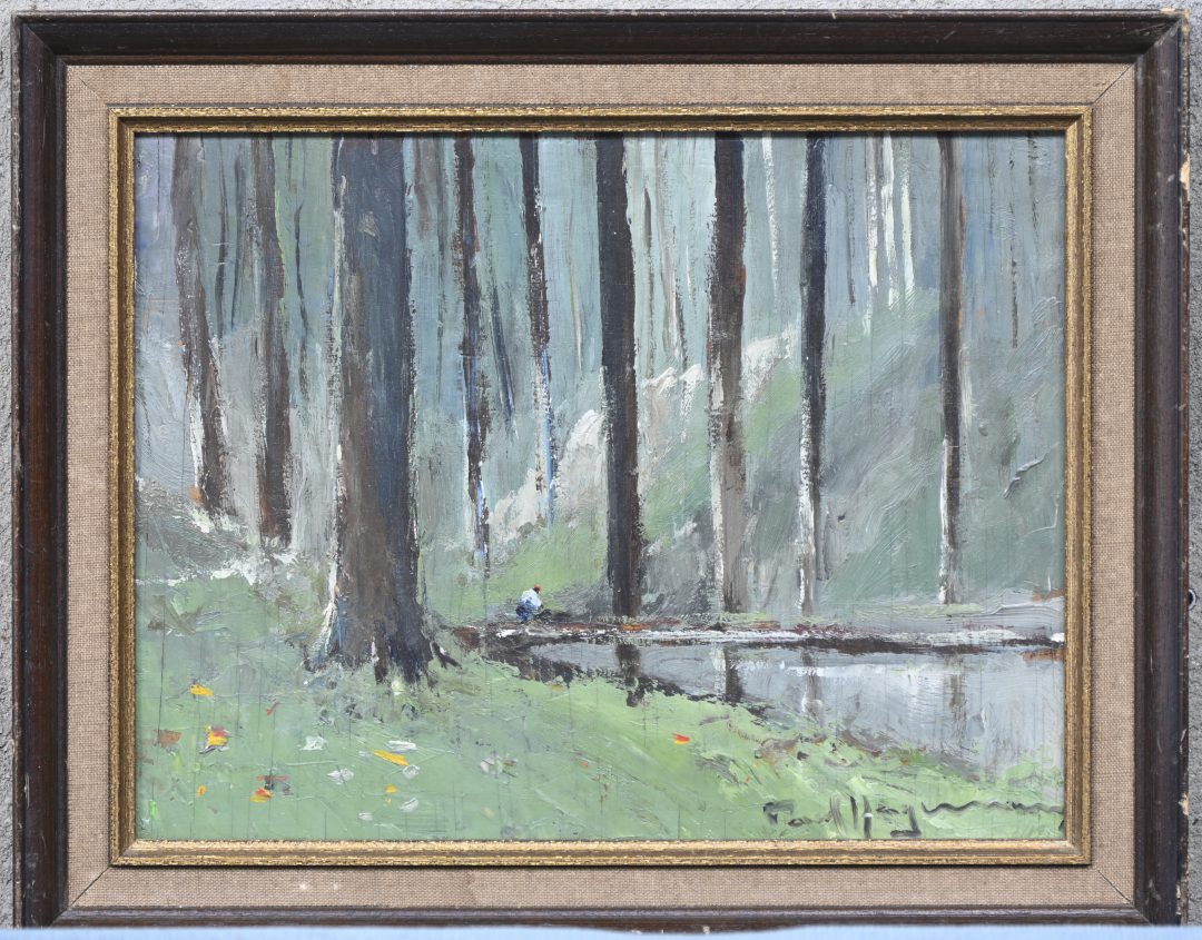 #569Jean-Guy BeernaertPeriod: 1928 - 1999“Bosdreef”, een églomisé, olieverf op glas, gesigneerd J.G. Beernaert.