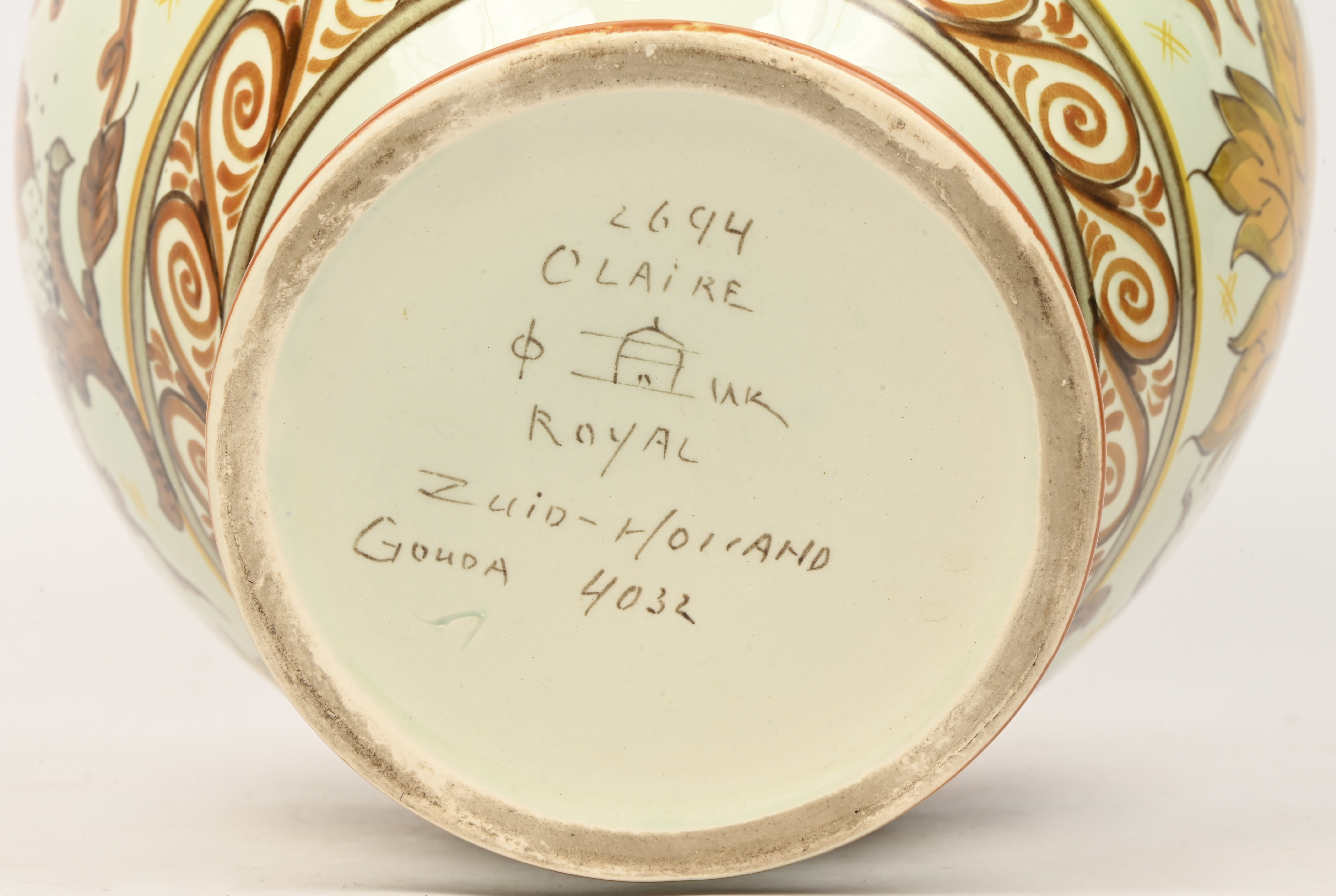 Een keramische dekselvaas in Delft blauw, gemerkt Petrus Regout Maastricht, toegevoegd een vaasje gemerkt DEC: Delfts. Hs.