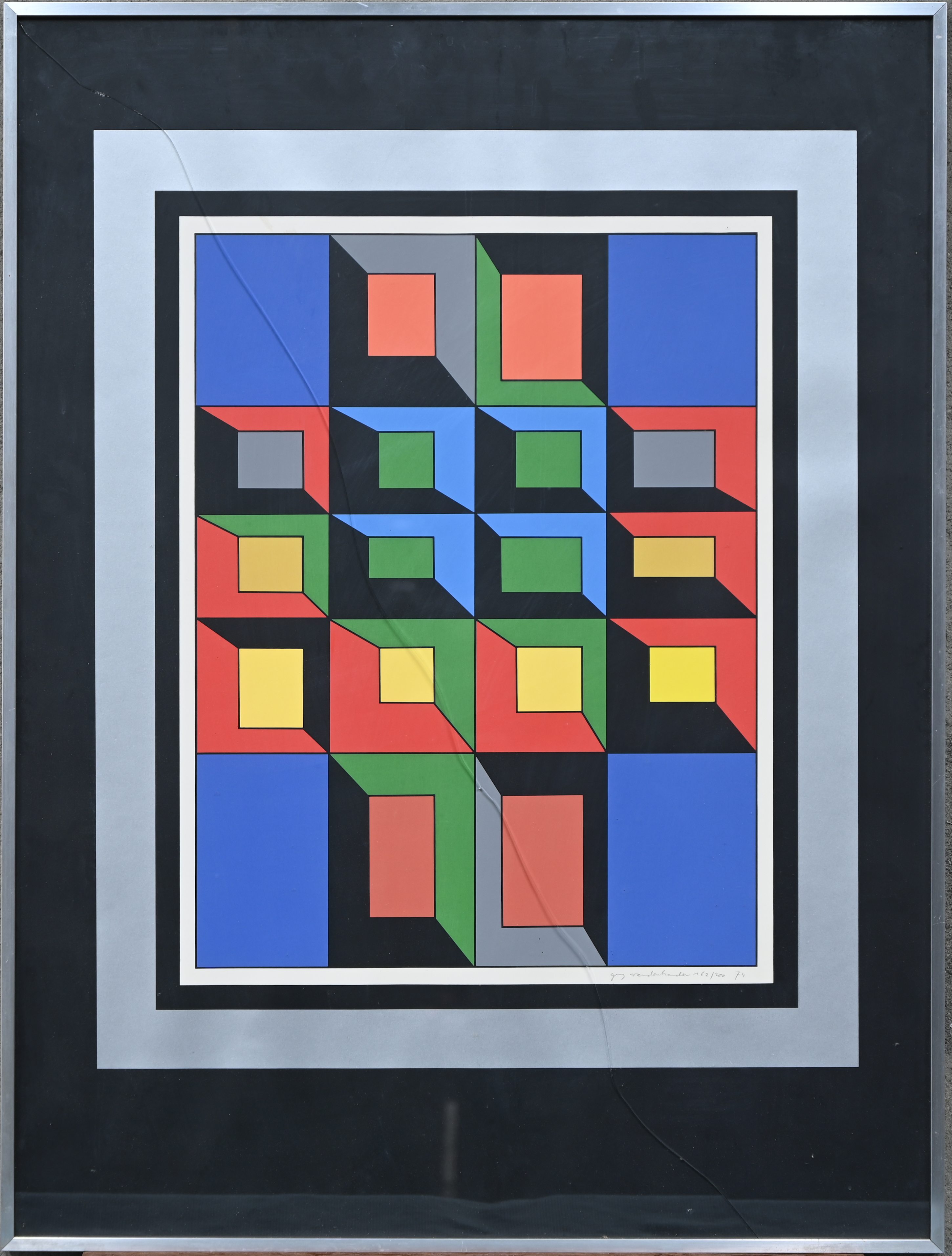 'Composition 1974,' a silkscreen print signed 'Guy Vandenbranden, '74.' Number 162 out of an edition of 200 copies. The glass of the frame is cracked.
