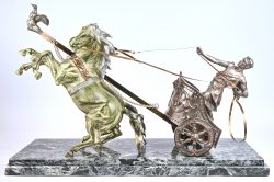 A composite sculpture depicting a Roman chariot, various materials including zamak and brass, on a green marble base. -