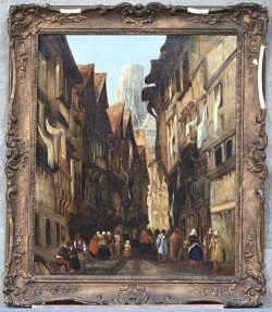 #282“Normandisch straatzicht” een schilderij, olieverf op doek, naar de 19e eeuw, niet gesigneerd.