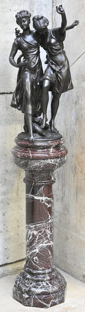 ‘Dansende vrouwen’, een beeldengroep van gepatineerd zamak. Naar werk van Moreau. Op een marmeren zuil.
