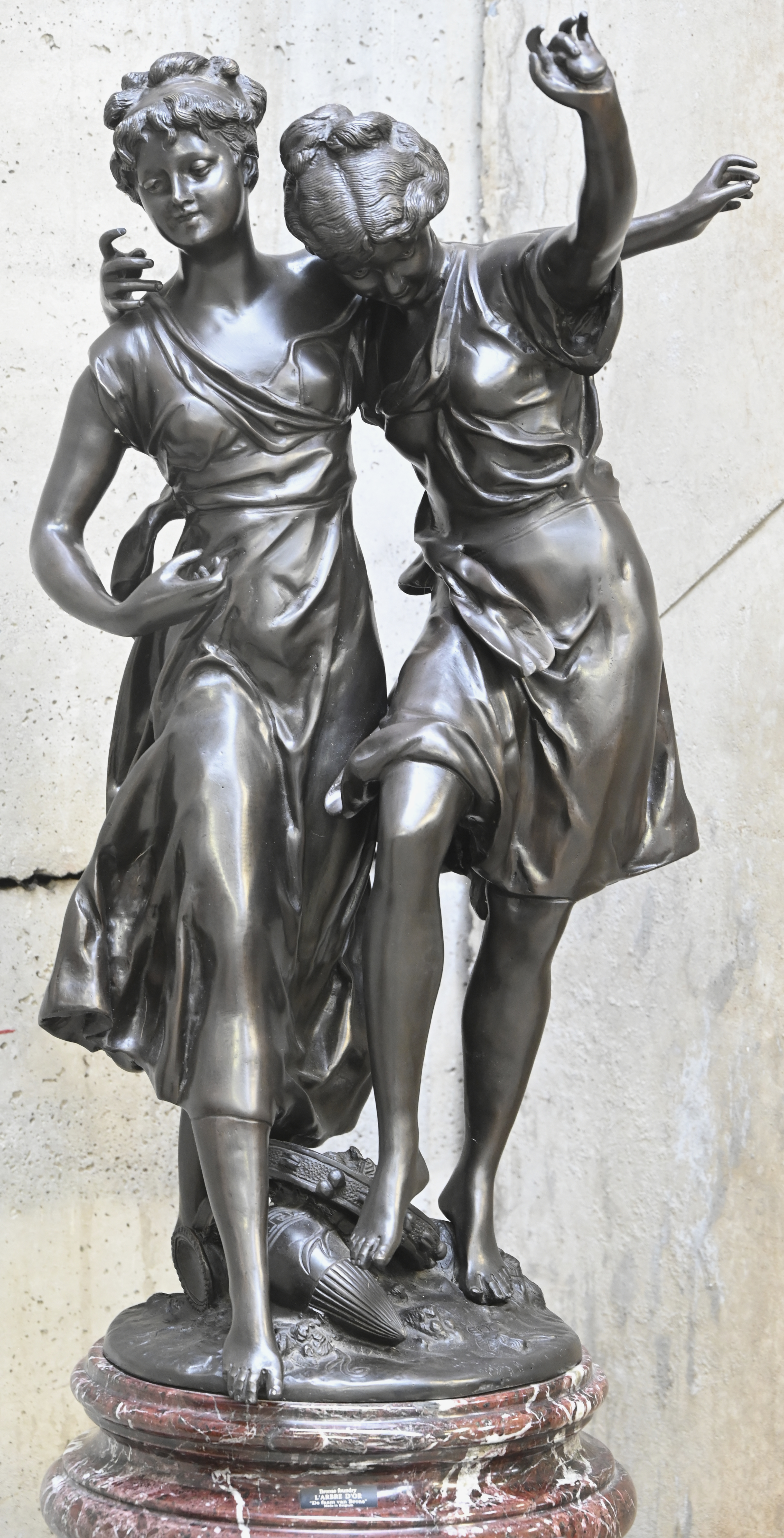 “Dancing Women,” a group sculpture in patinated zamak. After a work by Moreau. On a marble pedestal.