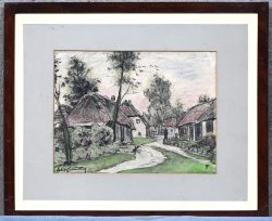 #409Felix TimmermansPeriod: 1886-1947‘Plattelandsdorpje’. Tekening in gemengde techniek, getekend.