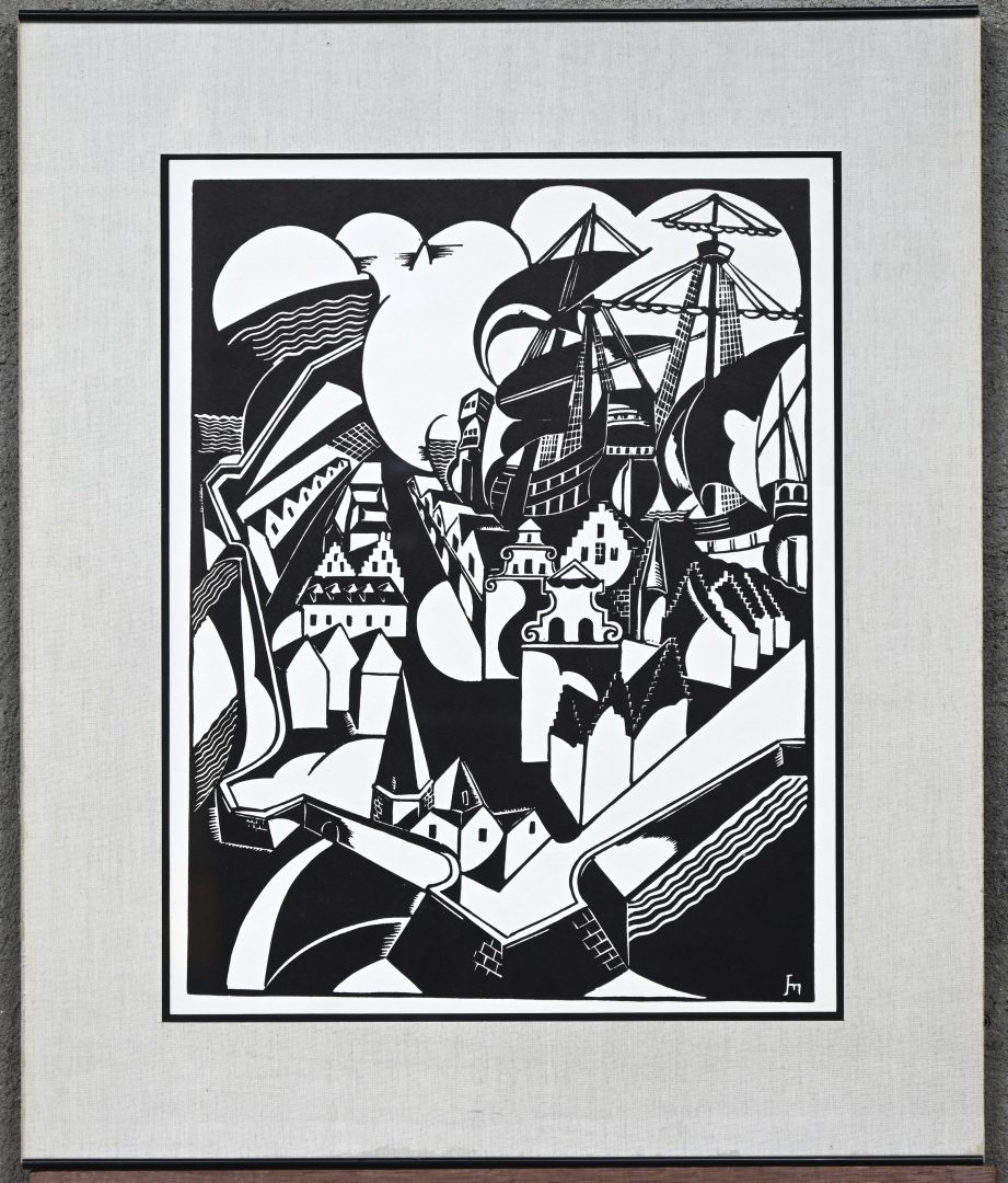 ‘A fisherman brings in the catch’, monochrome etching. Signed Lo. Peeters. 11-25. -