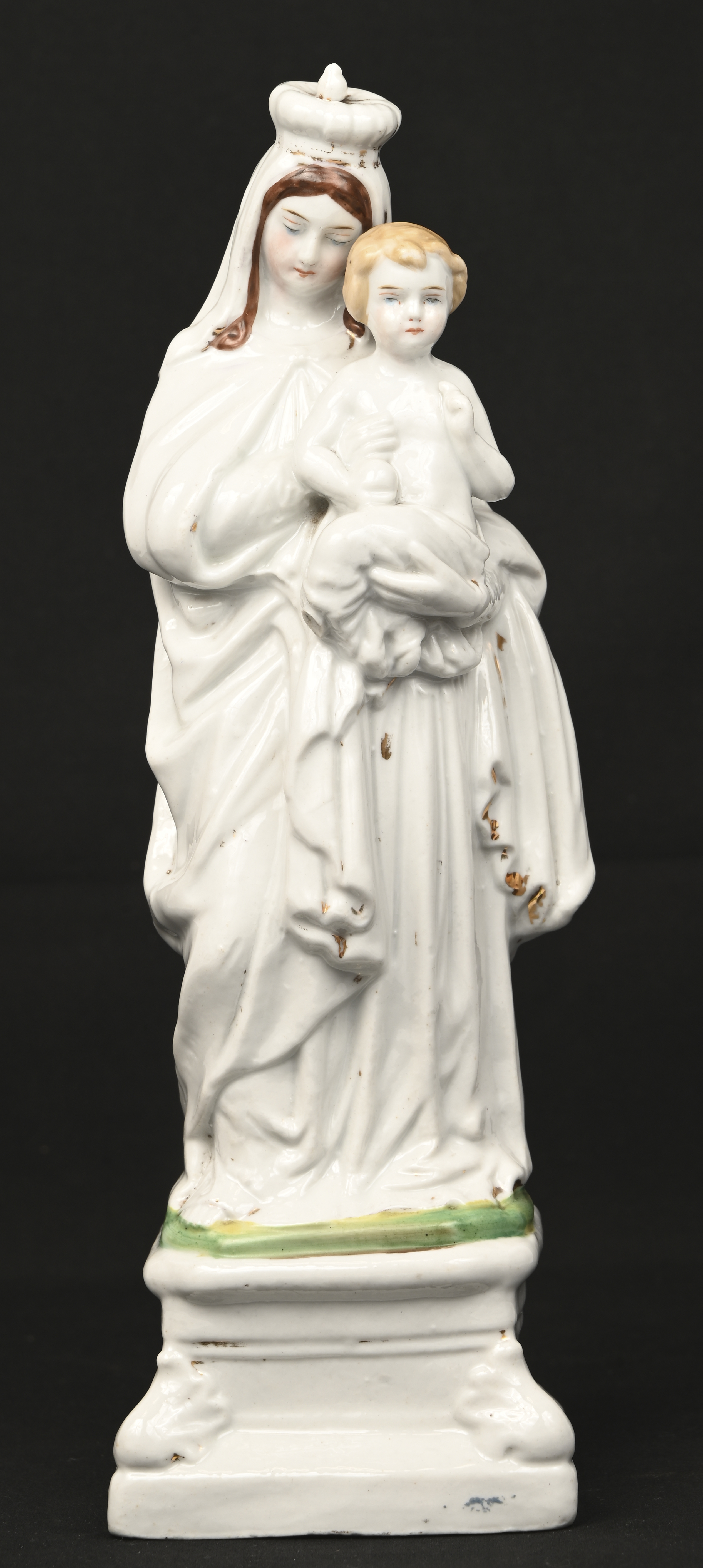 An old oval glass dome containing a Madonna in Brussels porcelain.No longer availableOnline onlyDim. h 42 cmEstimate: € 30 / 40 -