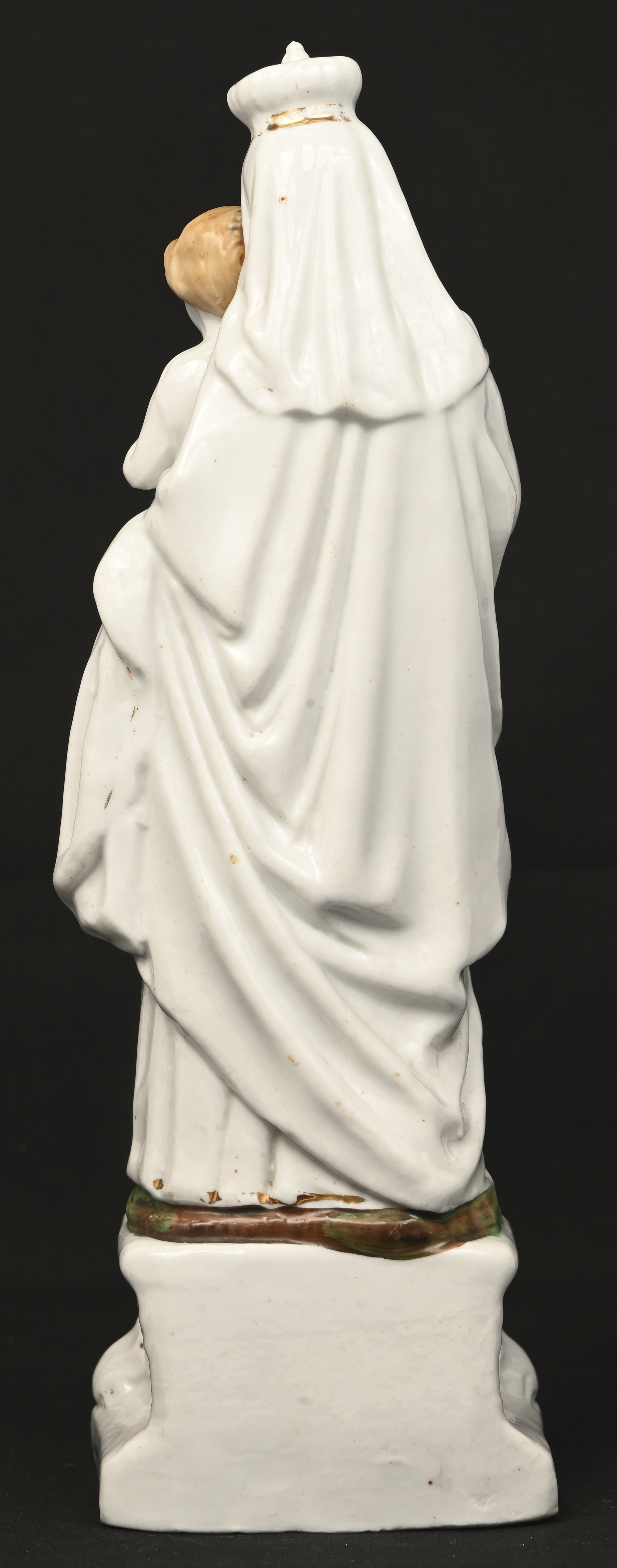 #201Een oude ovalen stolp met hierin een Madonna in Brussels porselein.