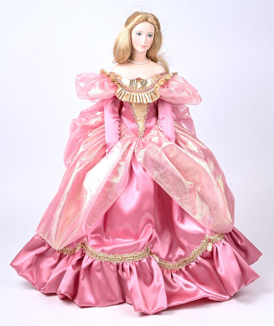 “De Kerstengel.” Een porseleinen pop met zijden jurk en benodigdheden, op sokkel, in originele doos. 1987.