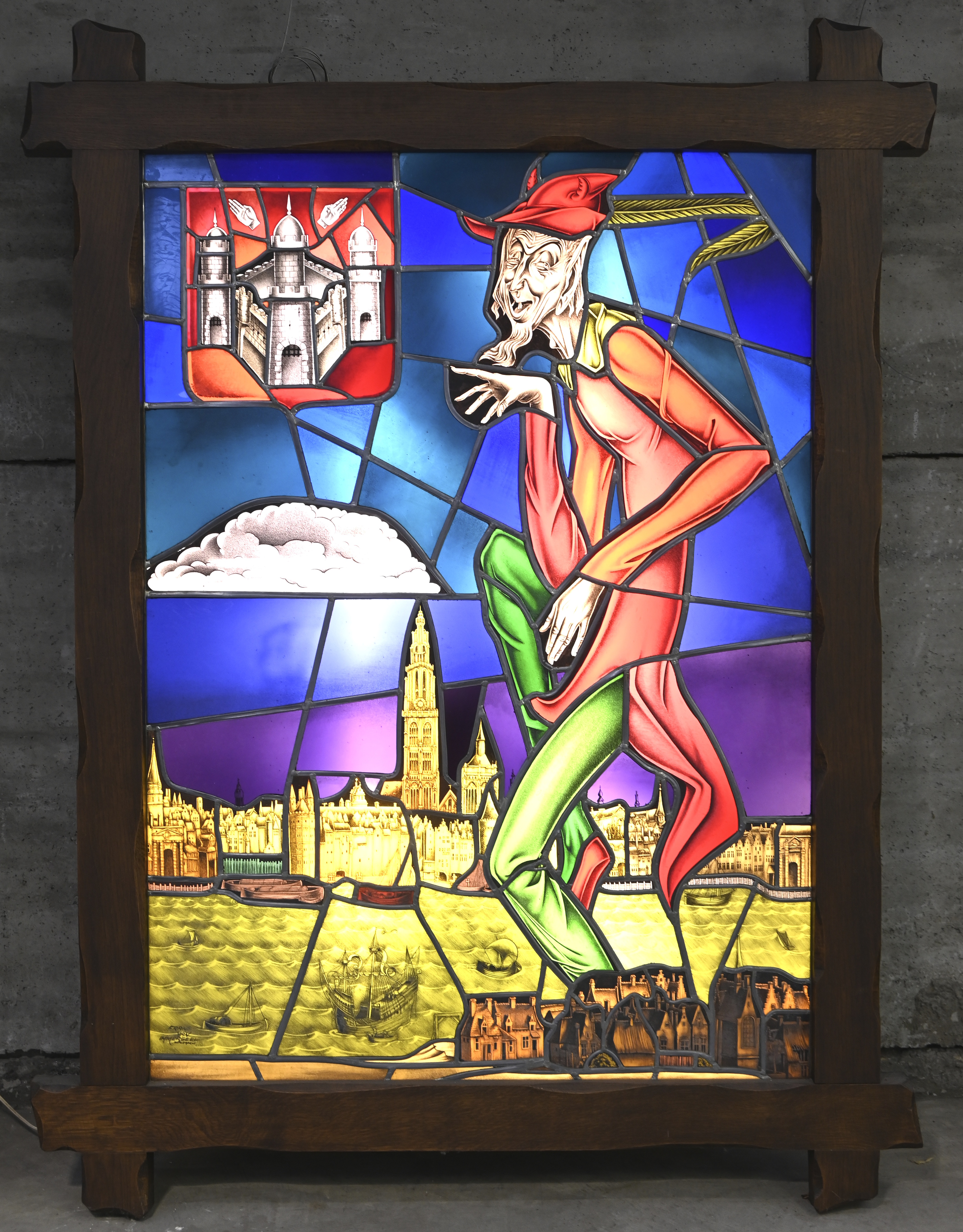 #219Frans Van ImmerseelPeriod: 1909 - 1978“De vrouw is het zout des levens, daarom moet de man drinken”, een glas-in-loodraam, gesigneerd.