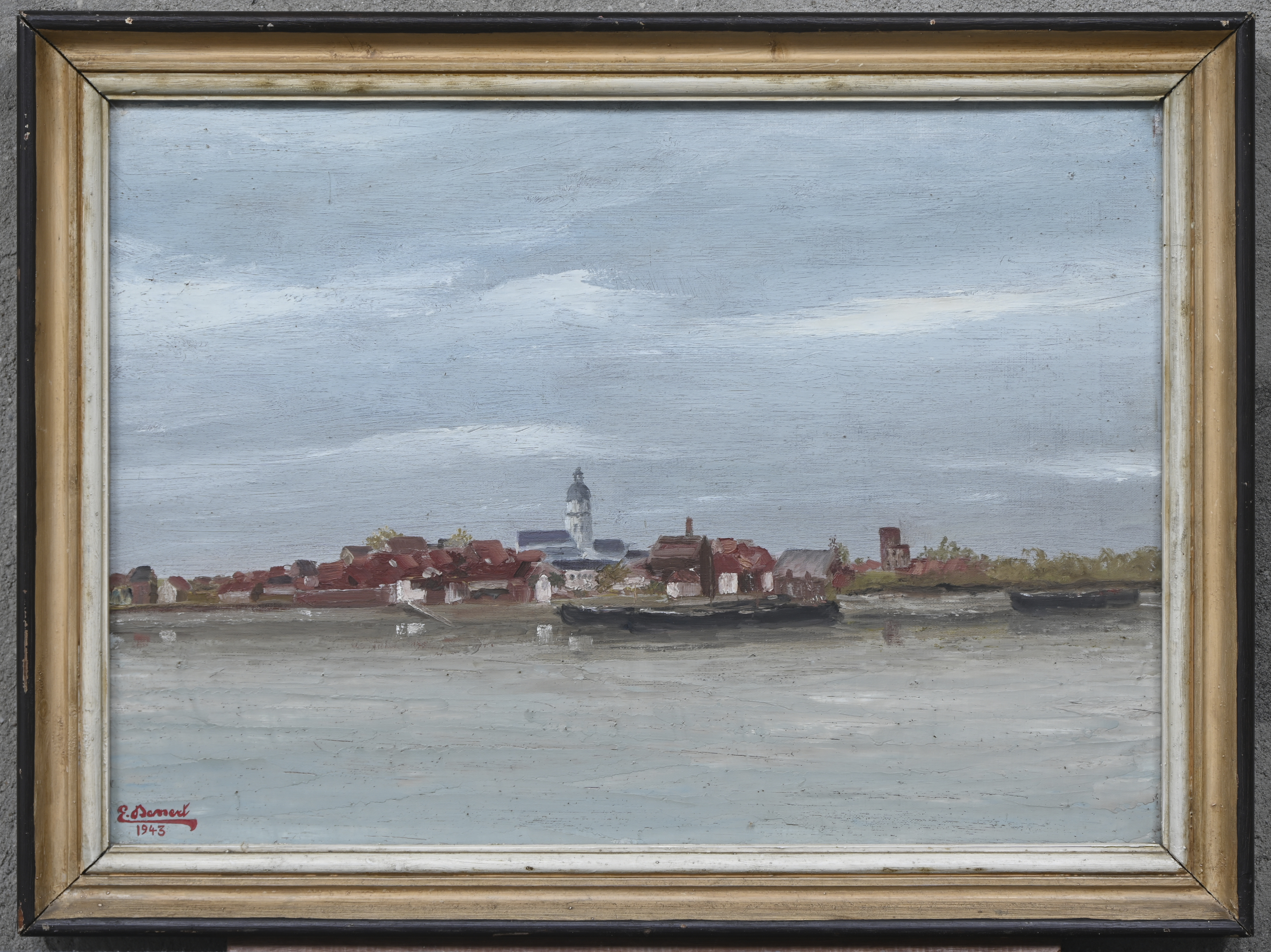 “De Schelde en Temse”. Olieverf op paneel, gesigneerd en gedateerd 1943.