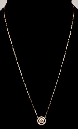 An 18kt yellow gold necklace with a pendant featuring a central brilliant cut diamond of 0.70 ct FSI2, surrounded by diamonds totaling 0.16 ct FVS1. -