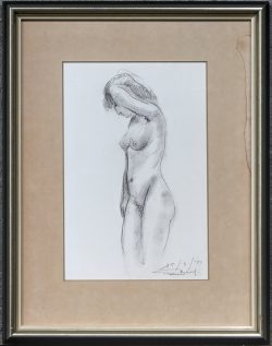 #354Germaine BrusPeriod: °1915“Staand naakt” potlood op papier. Gesigneerd en gedateerd ‘79.