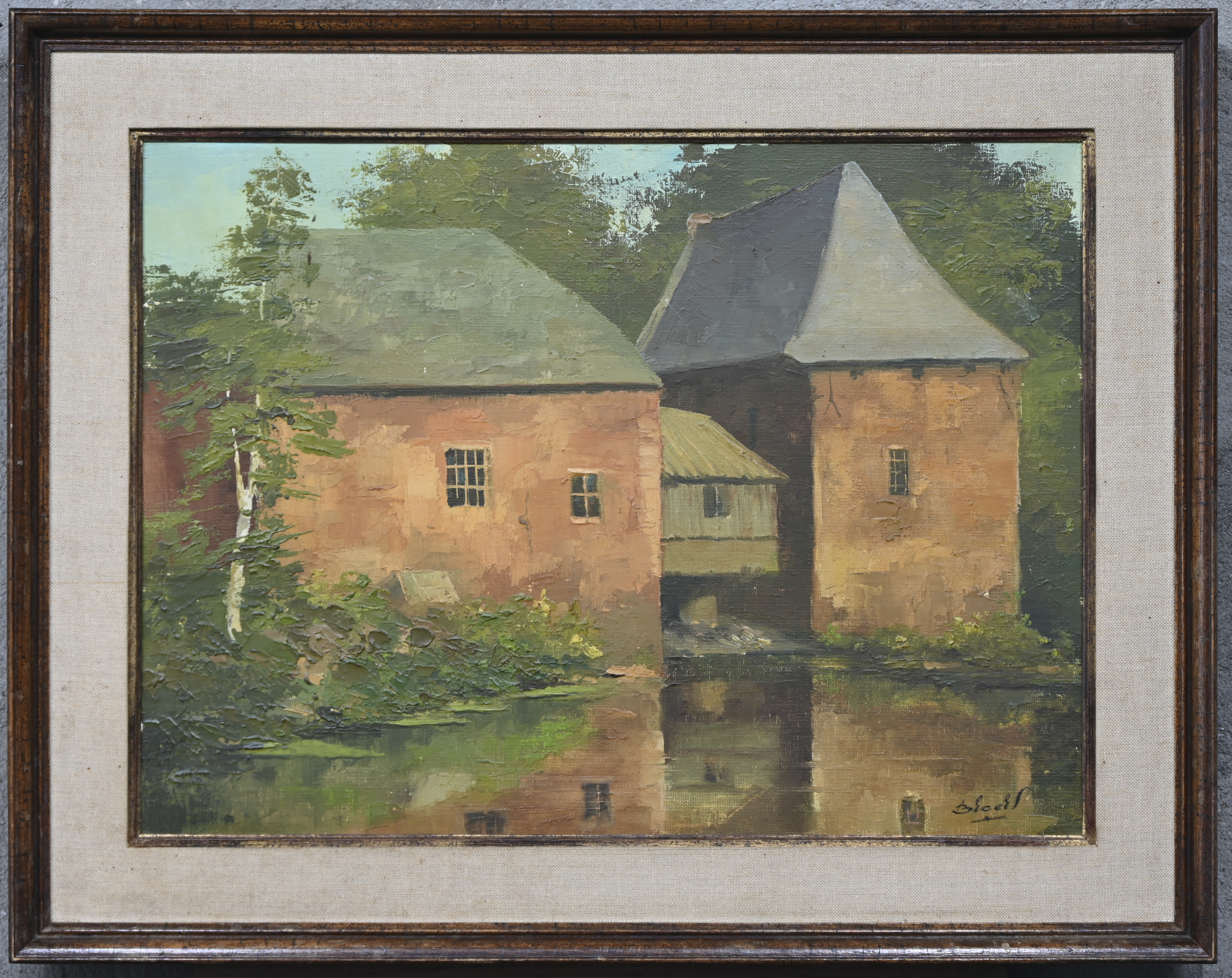 #182Jules Gonthier‘Landschap met kerk’, olieverf op karton. Getekend.