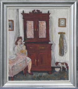 #222Theo HumbletPeriod: 1919-2006‘Interieur met moeder en kind’, een olieverfschilderij in naïeve stijl. Getekend Humblet.