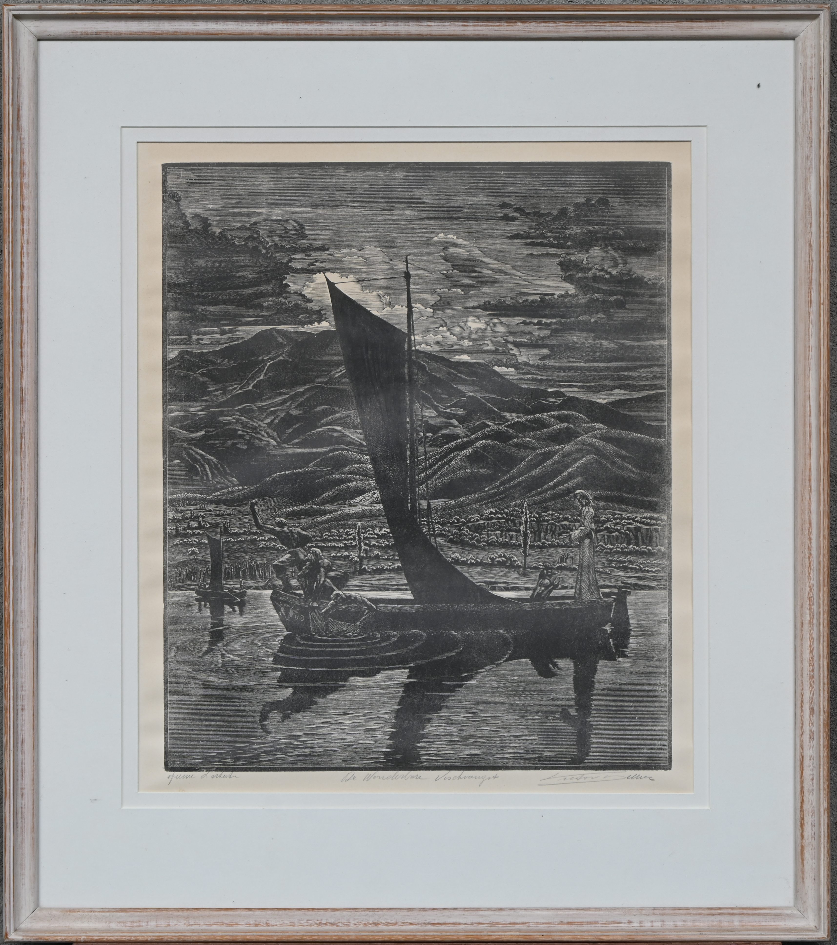 “De Wonderbare Visvangst.” Hoogdruk op papier. E.A. Gesigneerd buiten de plaat.