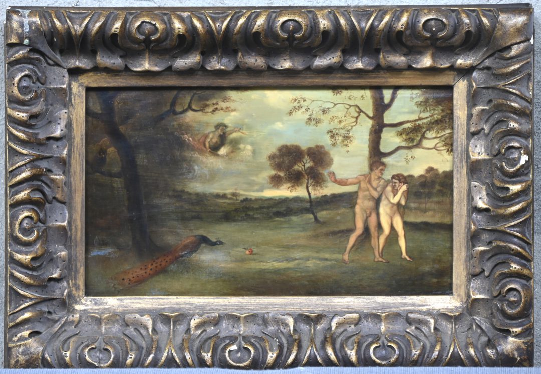 'The Fall of Man', an antique oil painting on panel. Not signed.