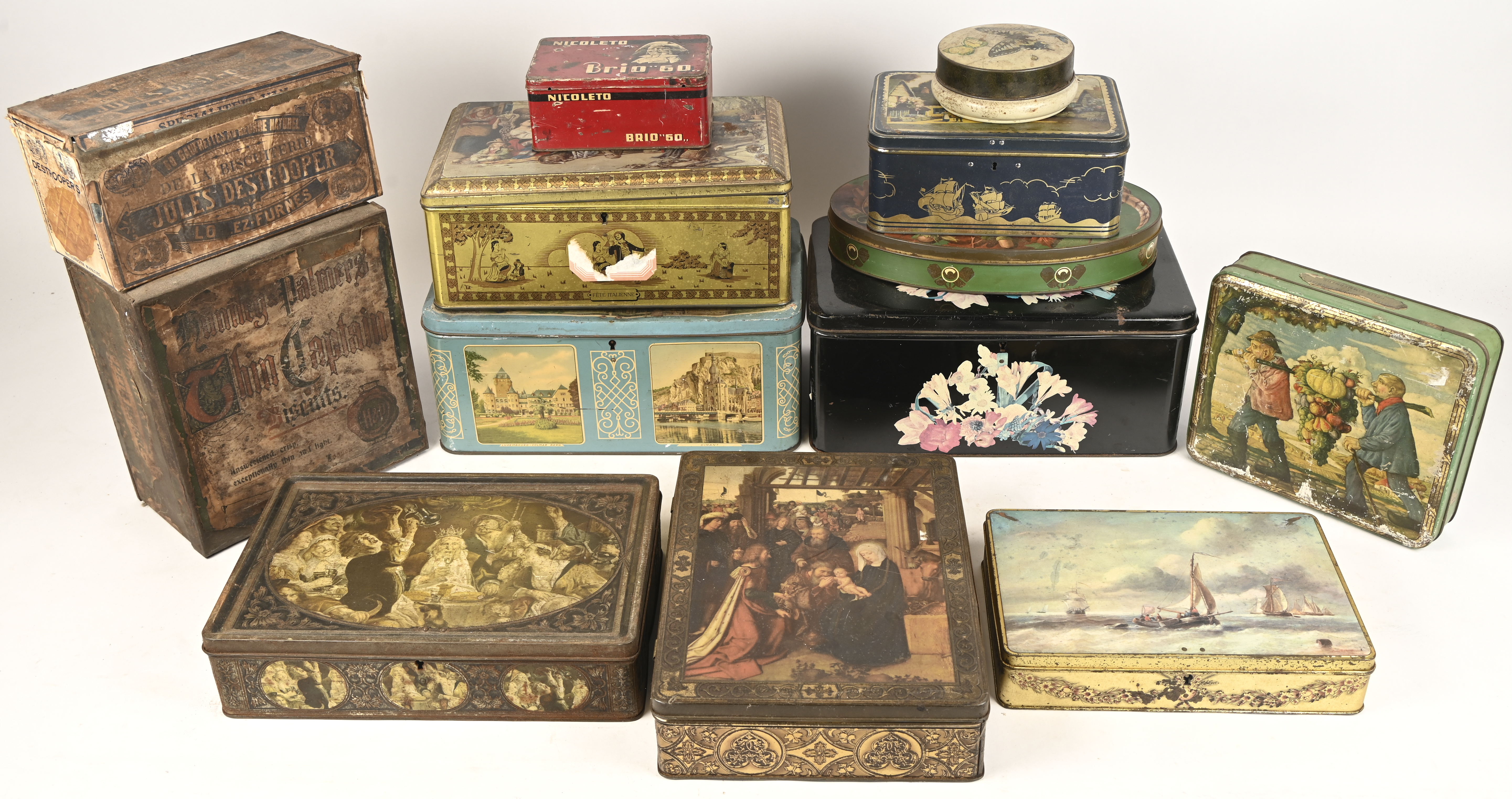 #100Dertig oude blikken dozen. Met gevarieerde onderwerpen en afmetingen.