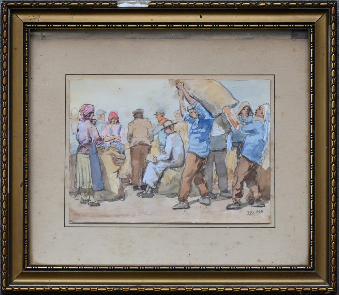 ‘Dockworkers’, a watercolor on paper. Signed J. Bollen.