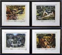 "The 4 seasons." A series of 4 works, mixed media on paper. Signed inside and outside the plates. According to the inscription, "trial copies."Dim. 43,5 x 52,5cmEstimate: € 400 / 600 -