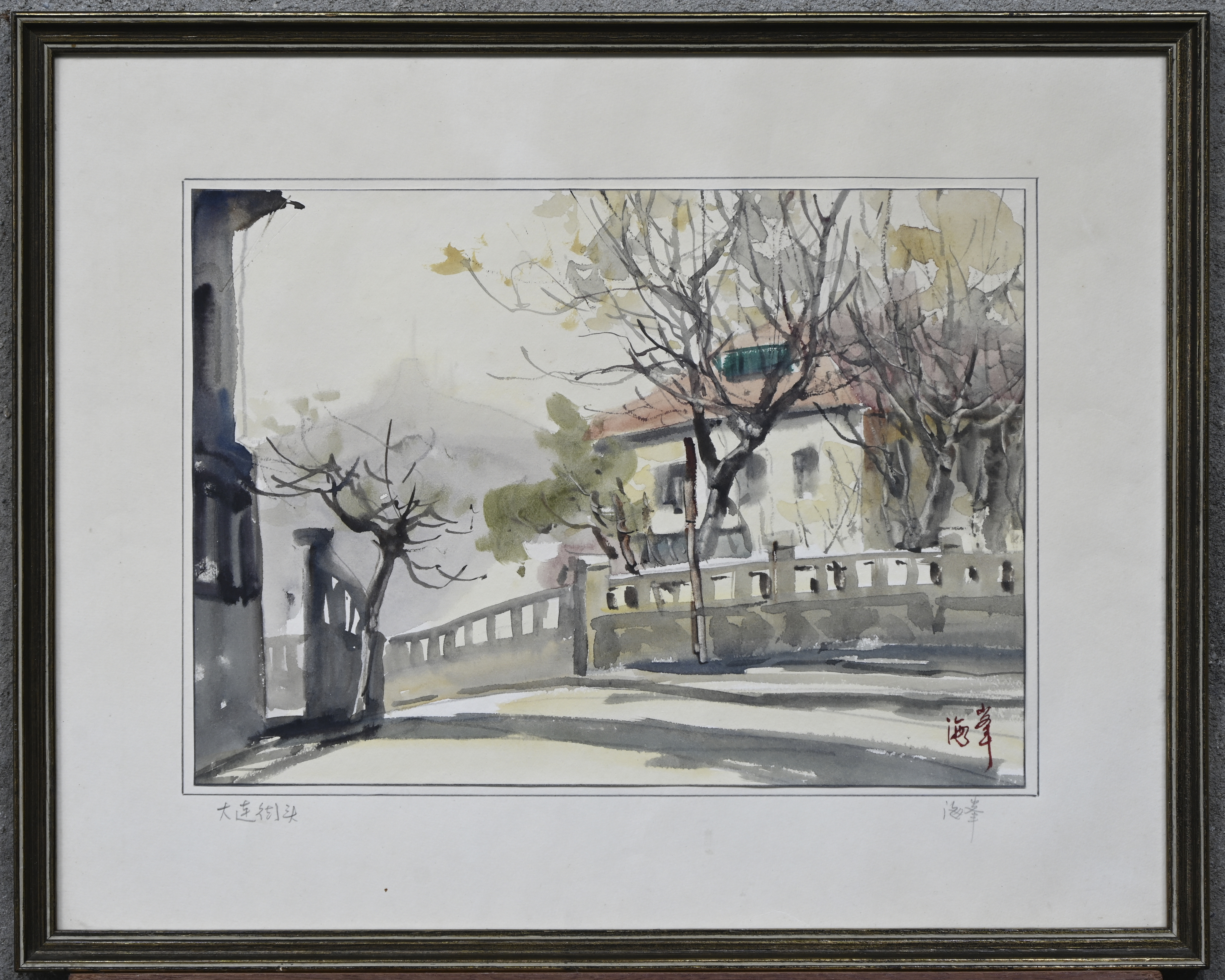 "Wooded Path". A painting, mixed media on paper. Signed and dated 1932 at the bottom. With label on the reverse. -