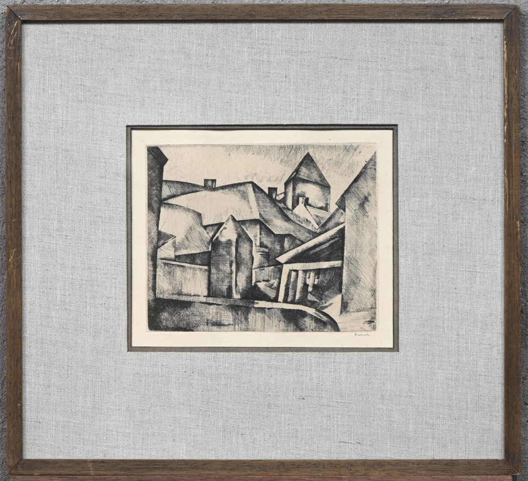‘Village view’, a monochrome etching in Cubist style. Signed Ramah.