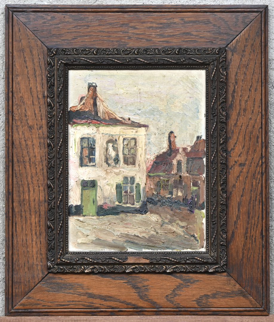 “Dorpszicht”, een schilderij, olieverf op doek, niet gesigneerd. Doek met kleine schade.