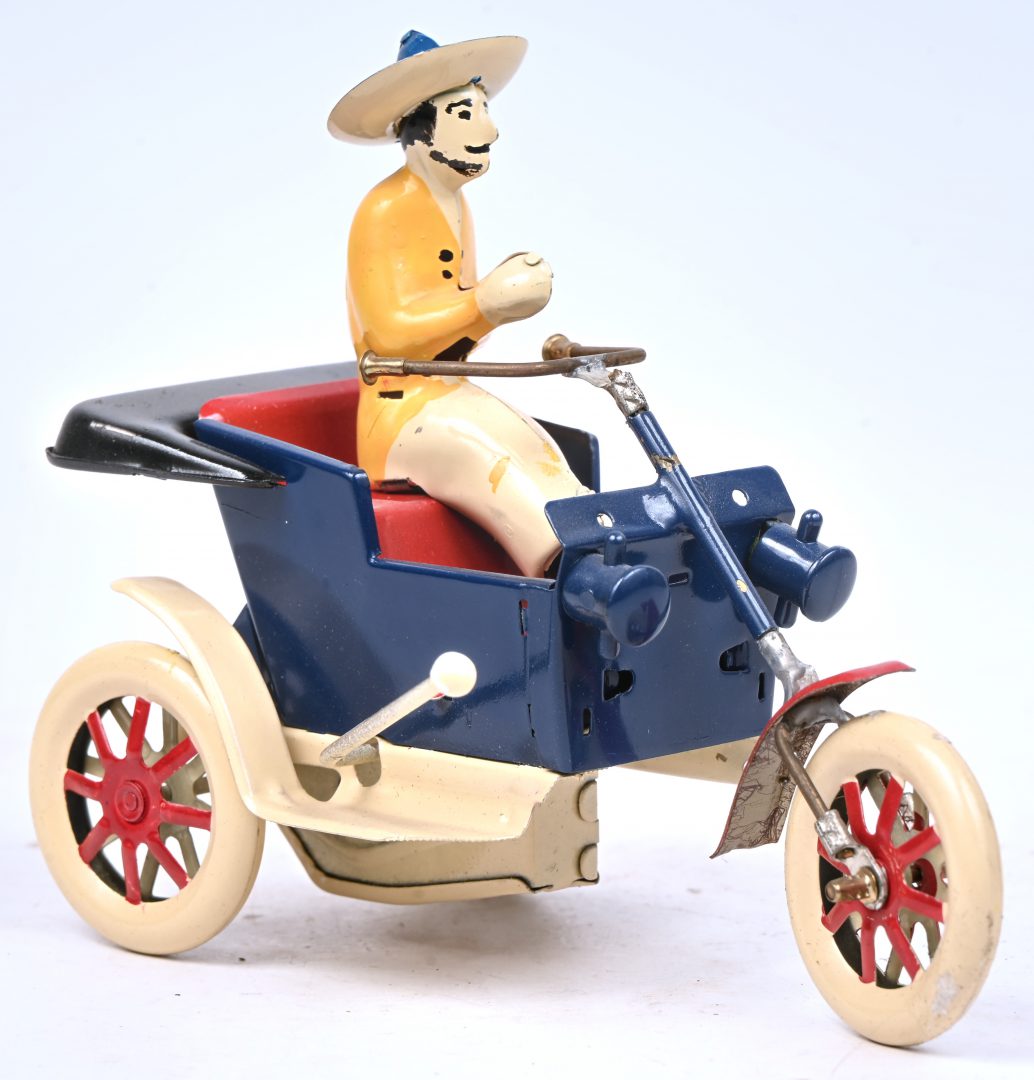 #22Nürnberger Bleichwaren Tucher & WalterTwee blikken straatvenders met een vliegwiel aangedreven karretje.