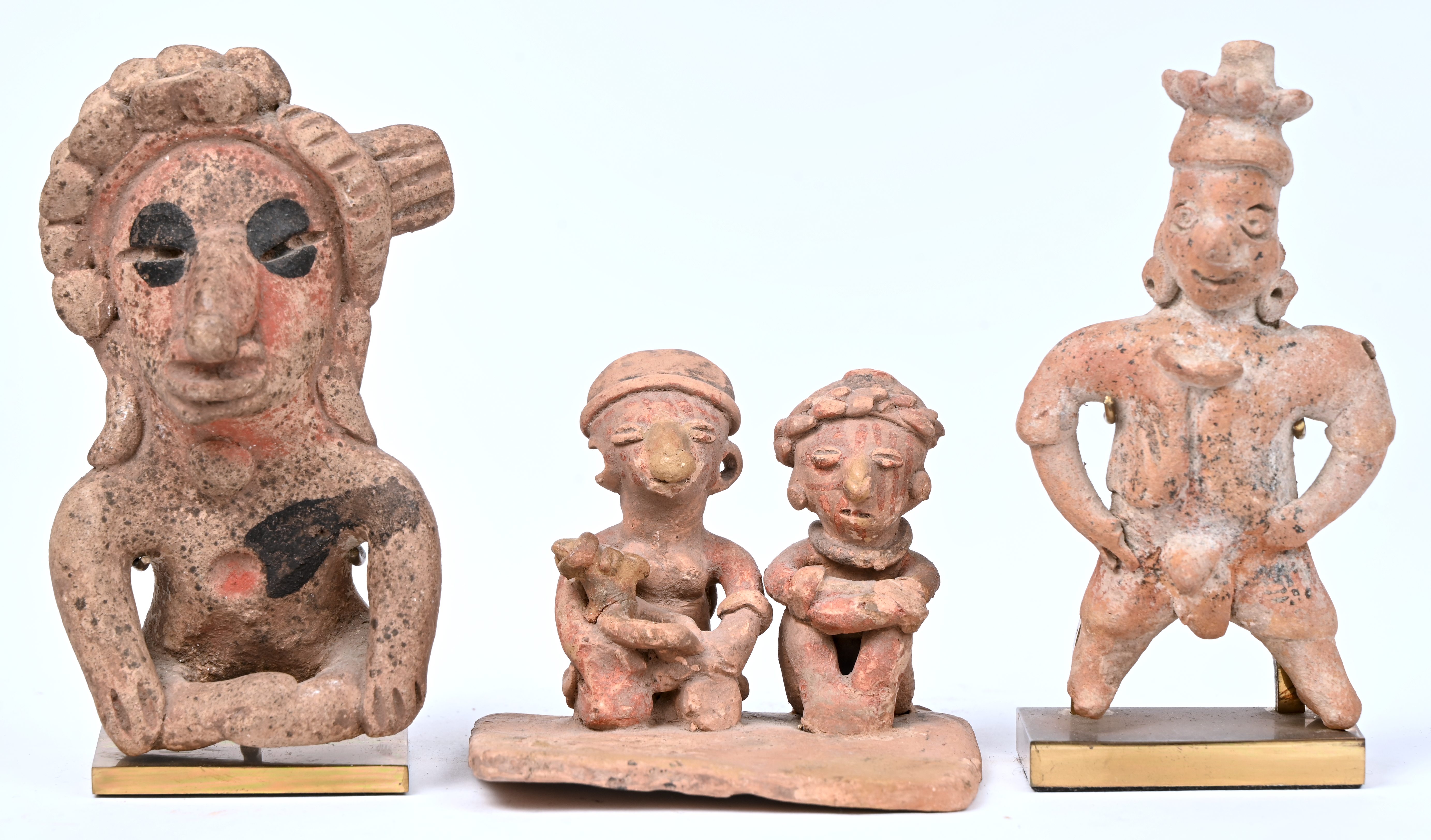 Three earthenware figurines in pre-Columbian style. One standing warrior, a seated couple with child and a seated figure with headdress. With remains of polychrome decoration.
