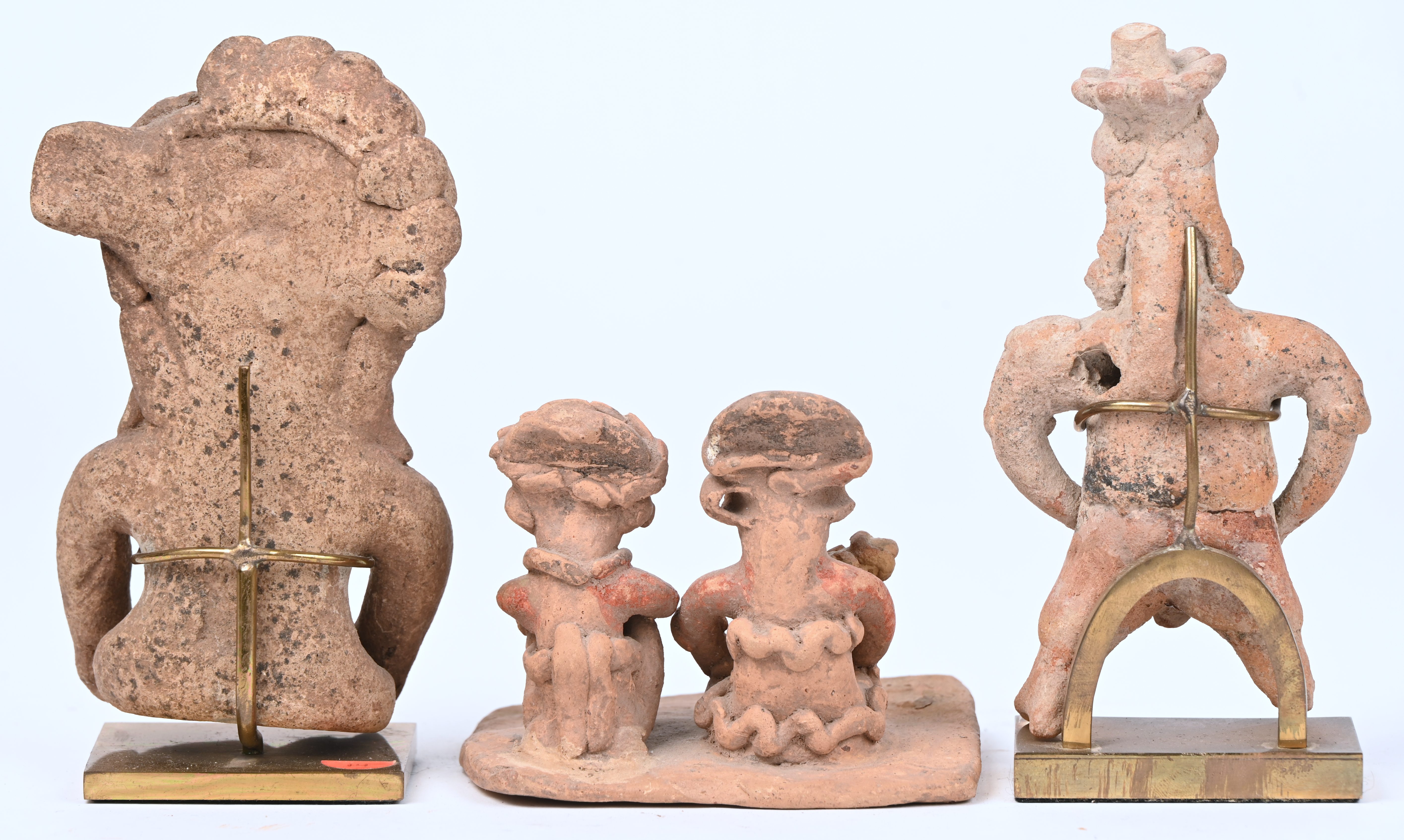 Drie aardewerken beeldjes in precolumbiaanse stijl. Een staande krijger, een zittend koppel met kind en een zittend figuur met hoofdtooi. Met resten van polychrome beschildering.