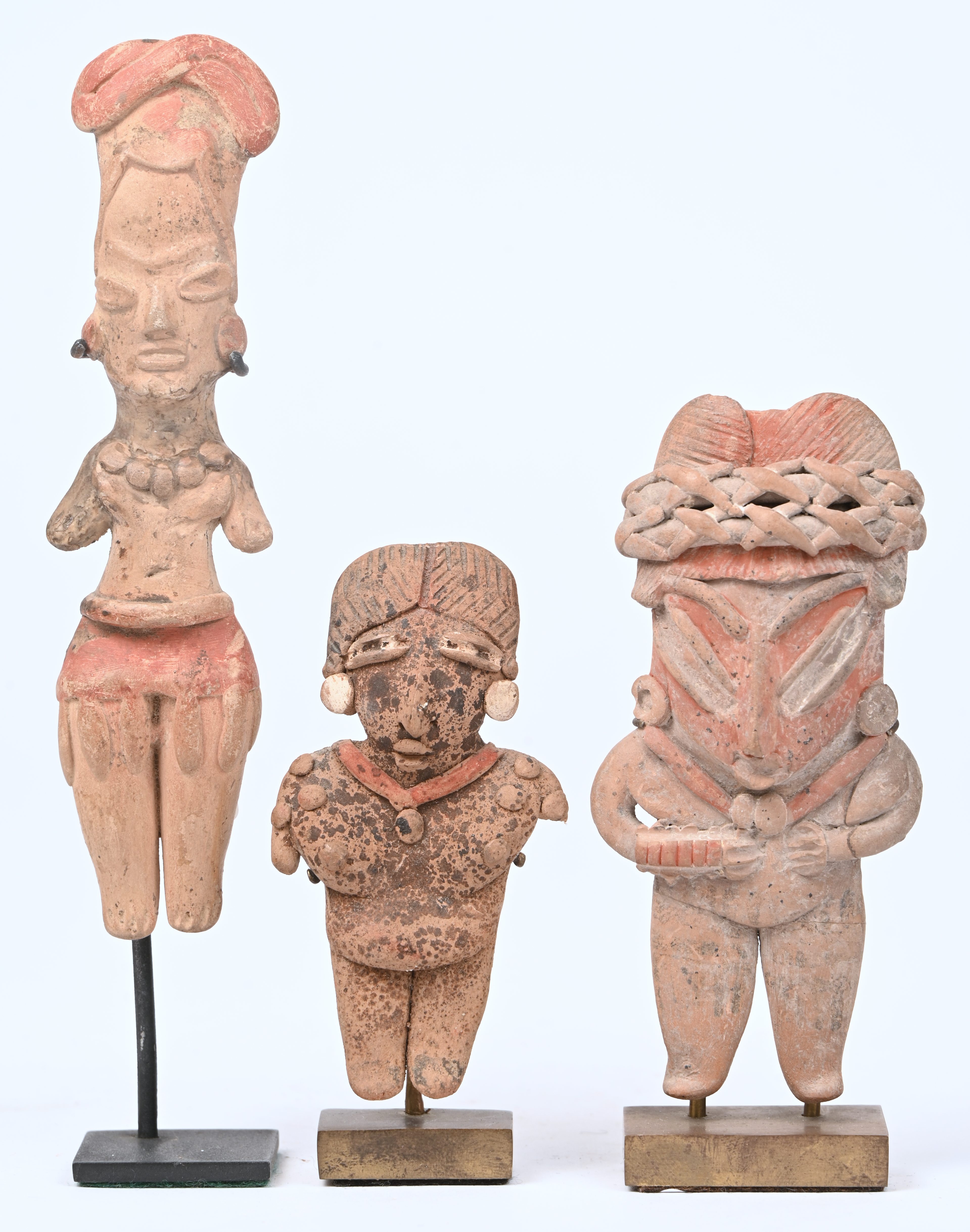 Drie aardewerken beeldjes van staande figuren, met resten van polychrome beschildering. In precolumbiaanse stijl.