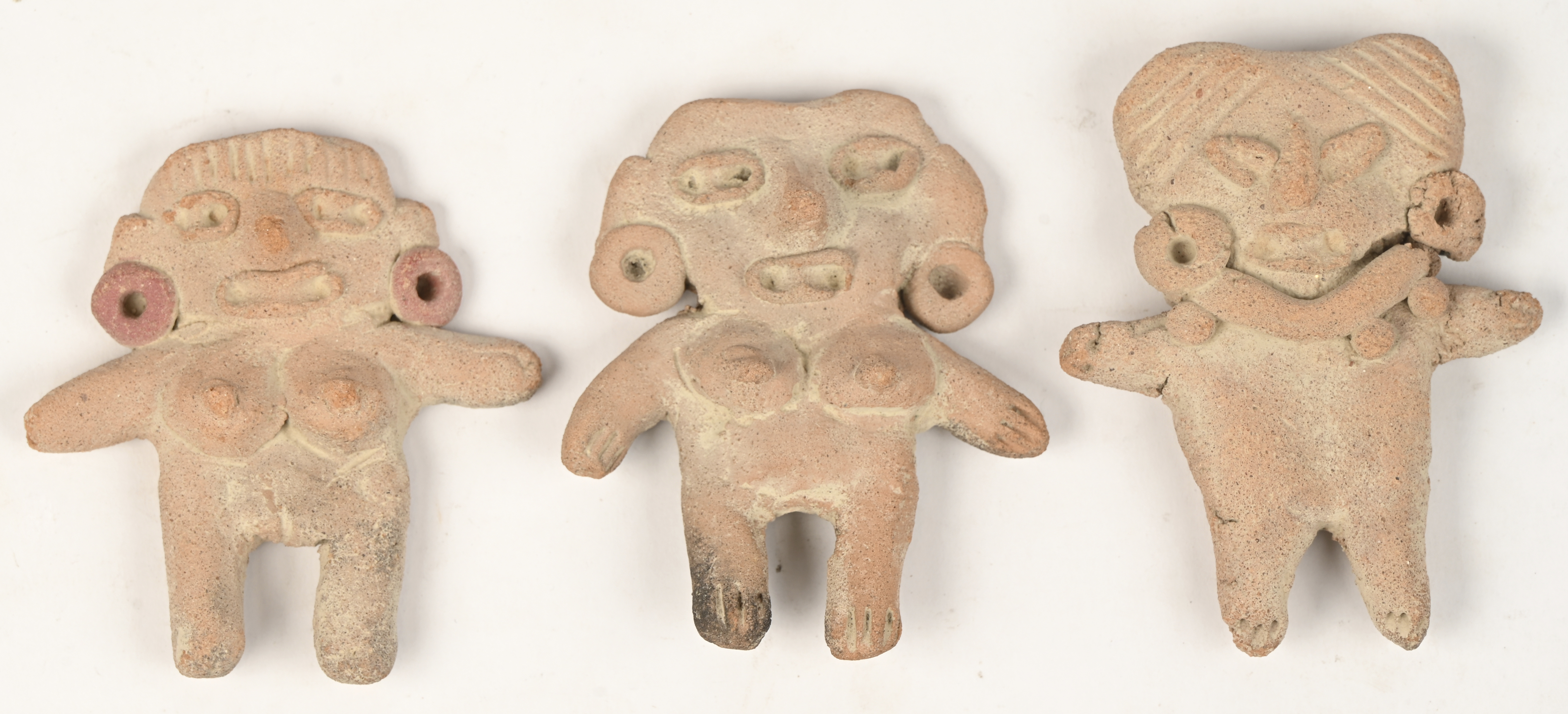 Three earthenware figurines of two women and one man with earrings, in Pre-Columbian style.