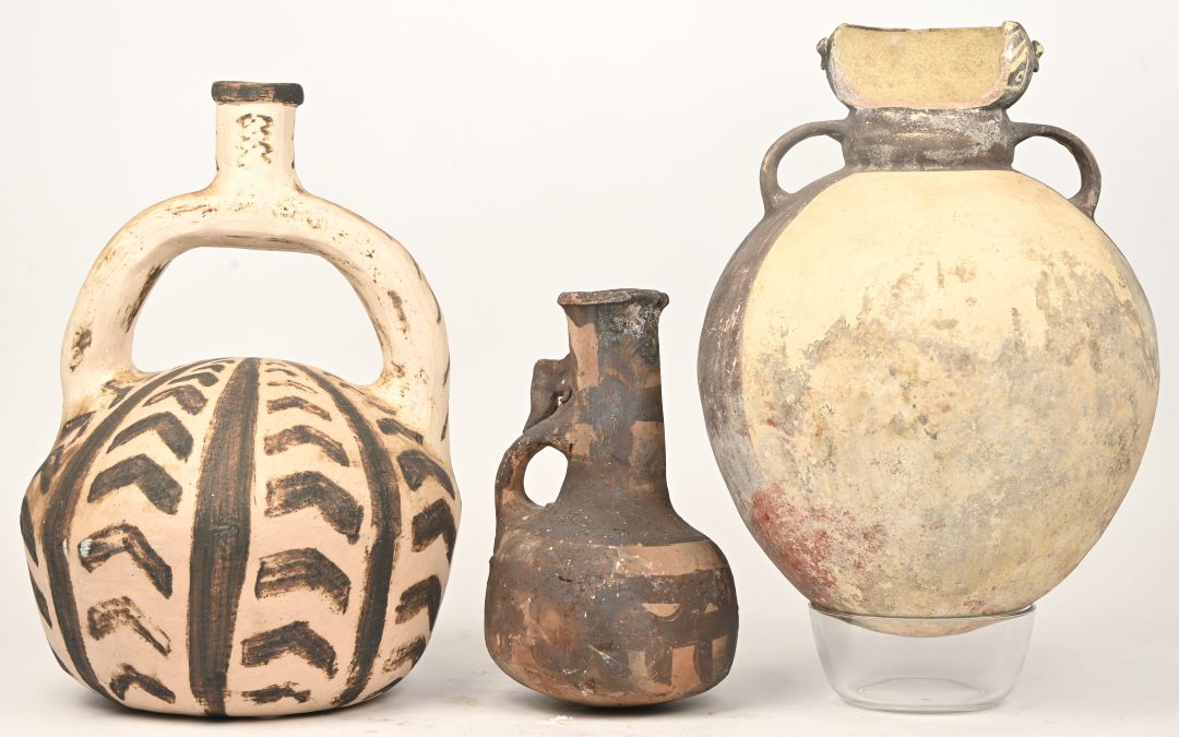 Three earthenware jugs inspired by Precolumbian designs. One jug has damage to the neck.