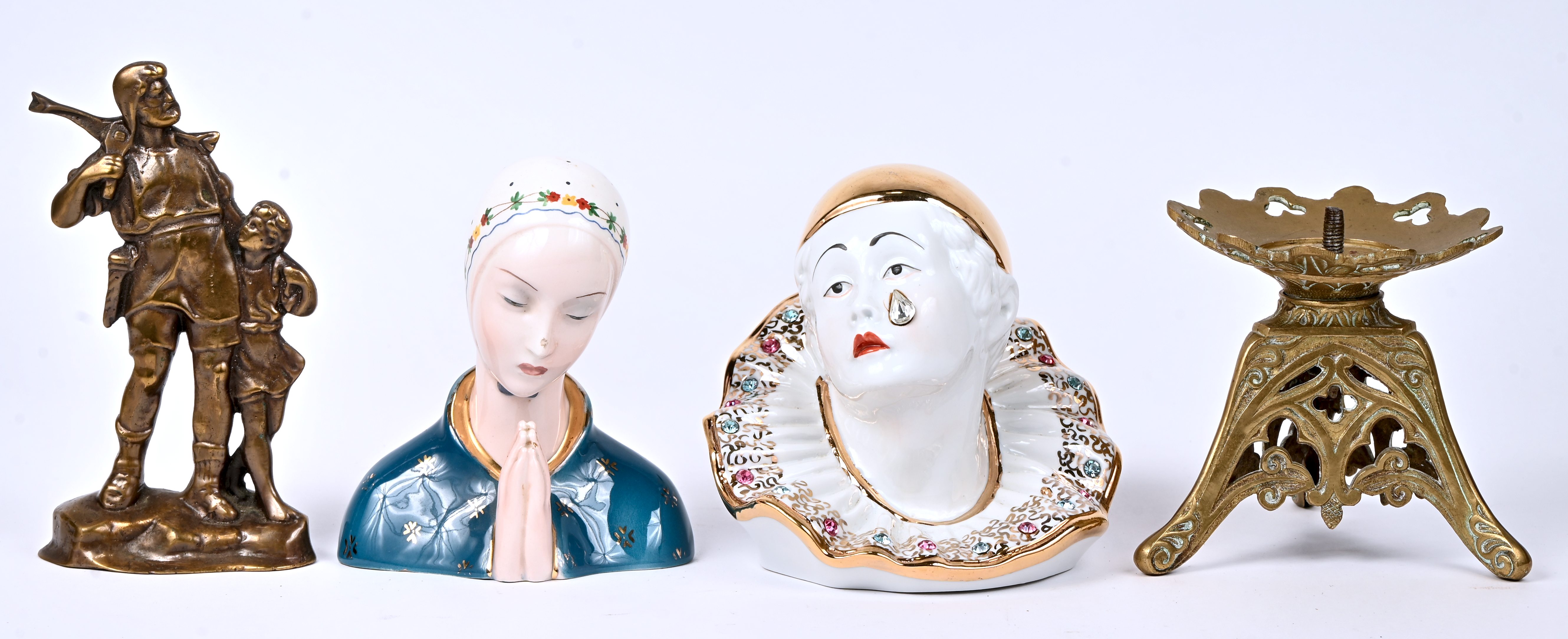 Three statuettes, two porcelain and one bronze. Also included is a bronze foot of a decorative bowl.