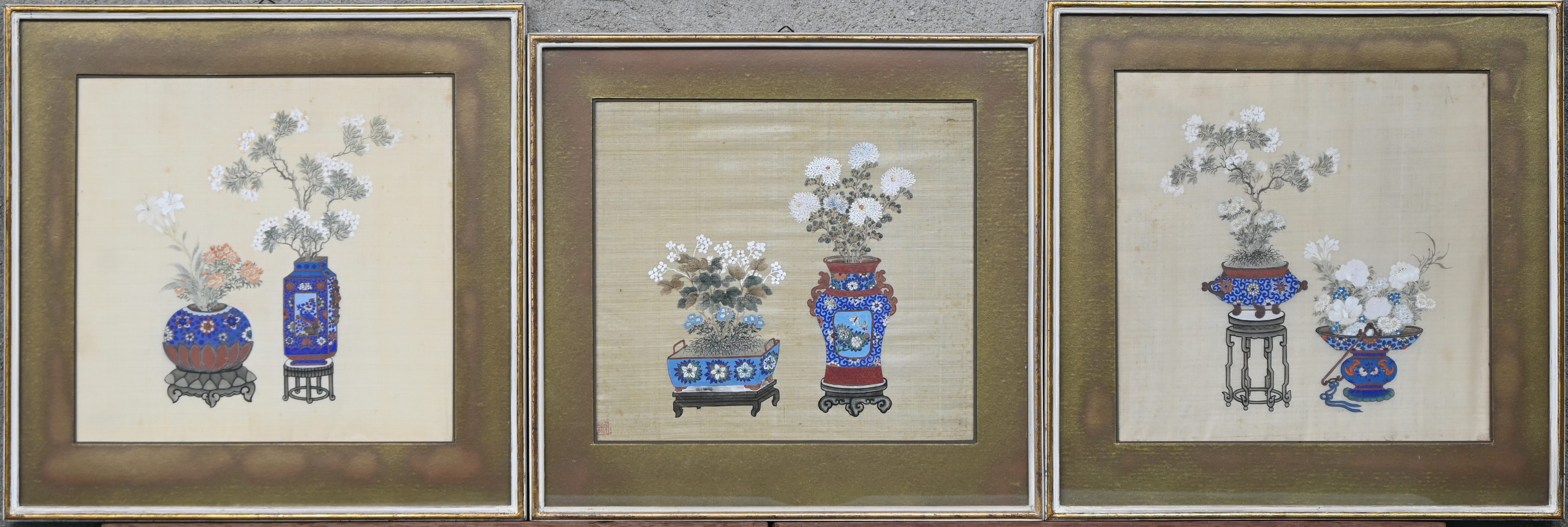 Three Chinese paintings on silk, depicting vases and flowers.