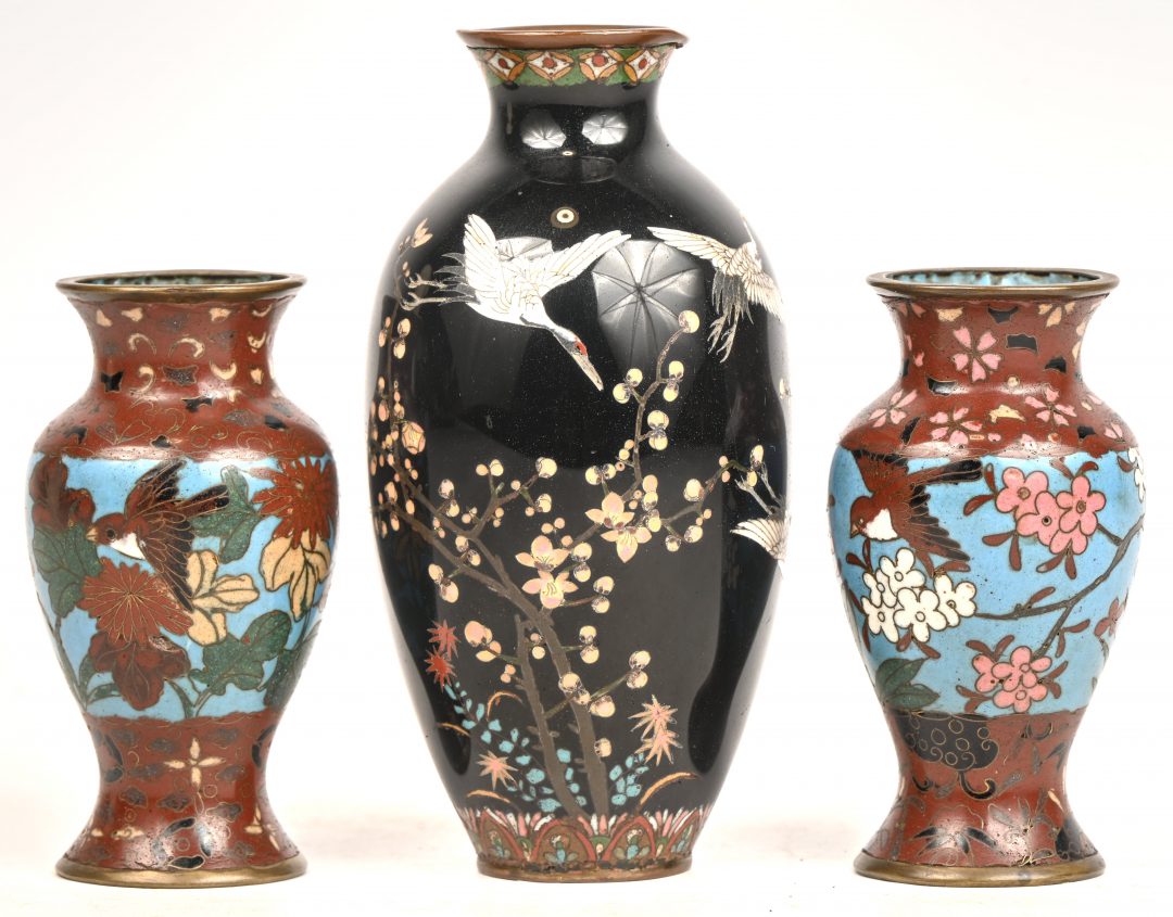 #347Een paar cloisonné vazen met floraal motief.