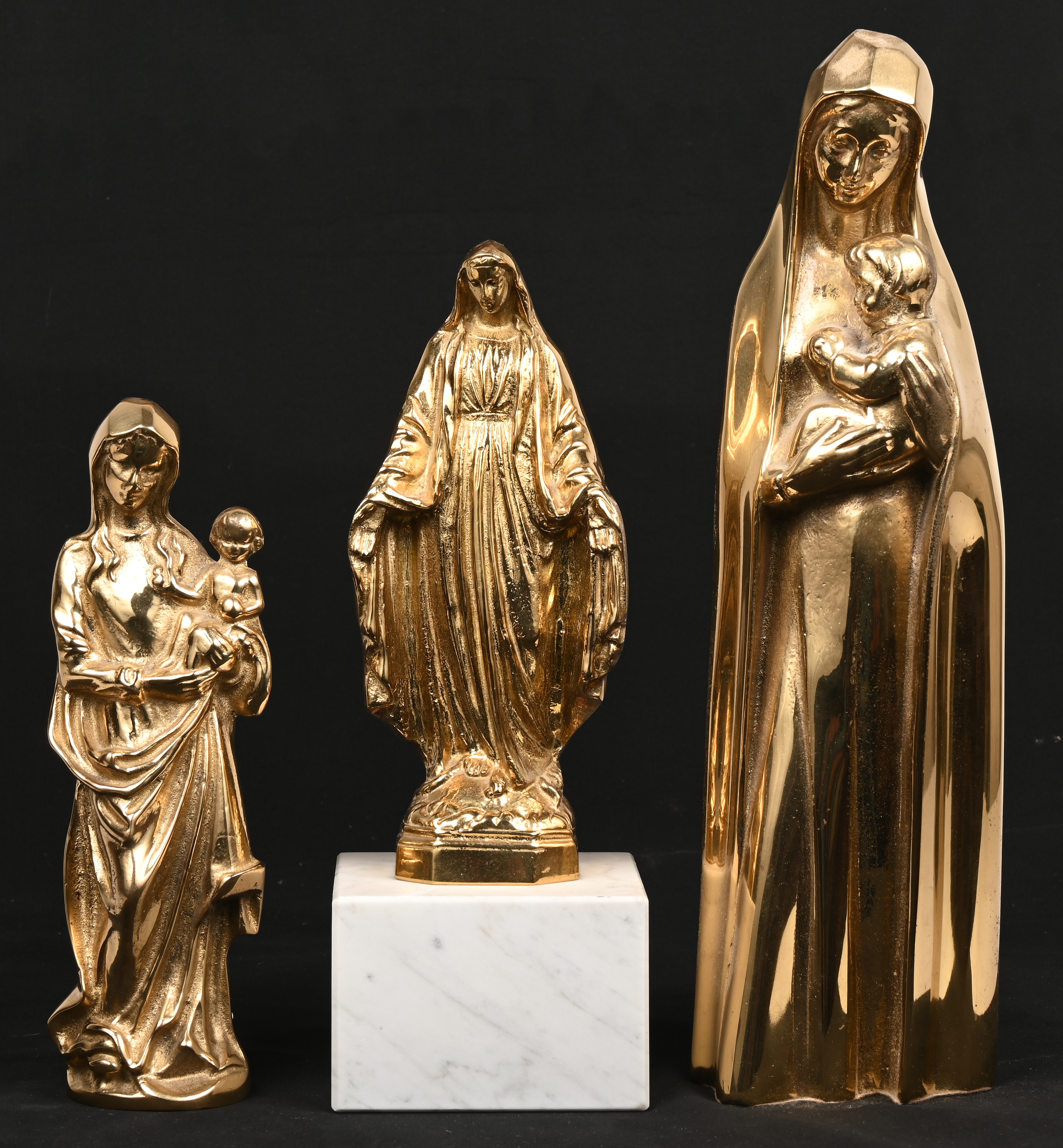 Trois différentes statues de la Vierge en laiton.