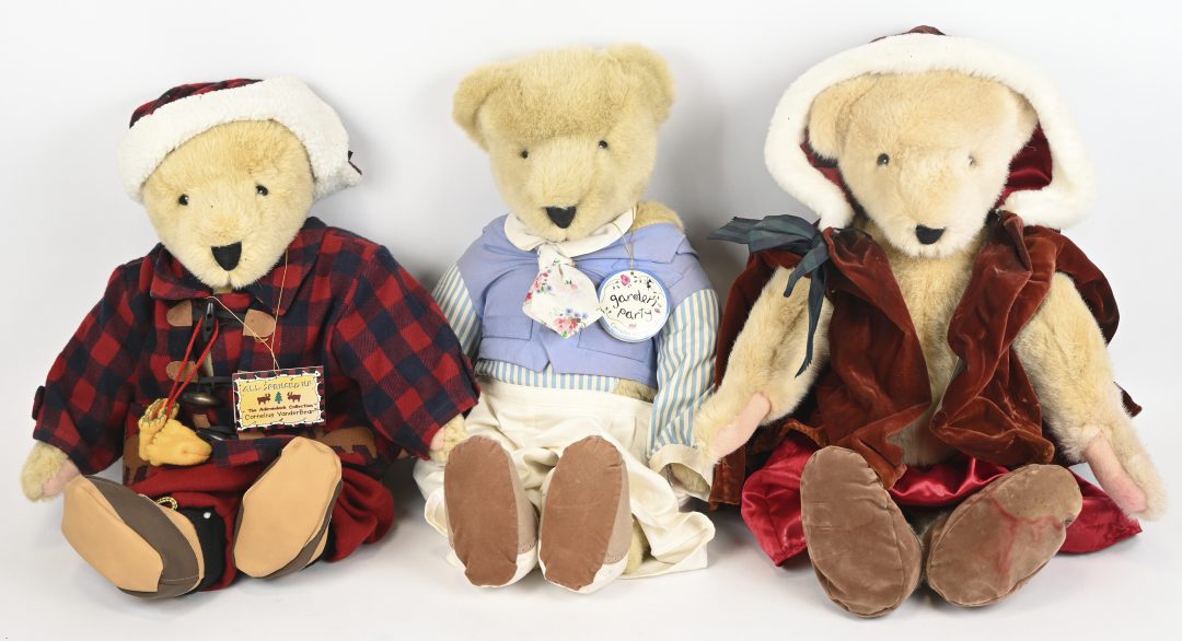 Drie grote teddyberen uit de ‘Cornelius Vanderbear’ reeks door de ‘North American Bear Co.’ ‘Take A Hike, a walk on the wylde side’, ‘’All Spruced Up’ & ‘Garden Partry, the Scent of Spring’.