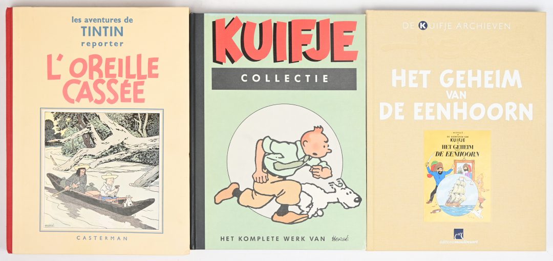 Drie hardcovers met werk van Hergé. ‘Het mysterie van straal V’, ‘L’oreille cassée’ en ‘Het geheim van de Eenhoorn’ uit de reeks de Kuifje archieven.