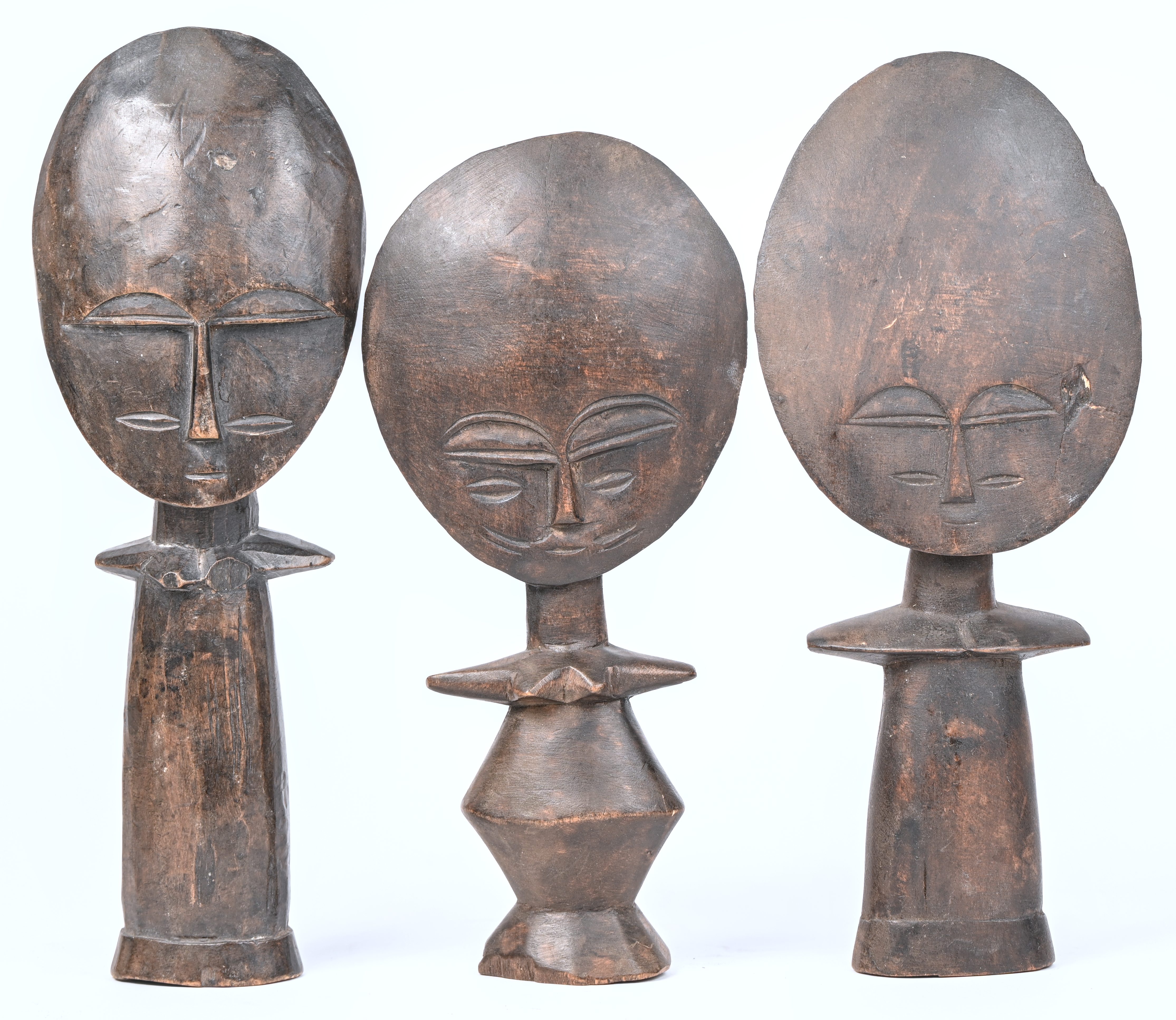 Three wooden fertility figures, Akua’ba by the Ashanti, Ghana.