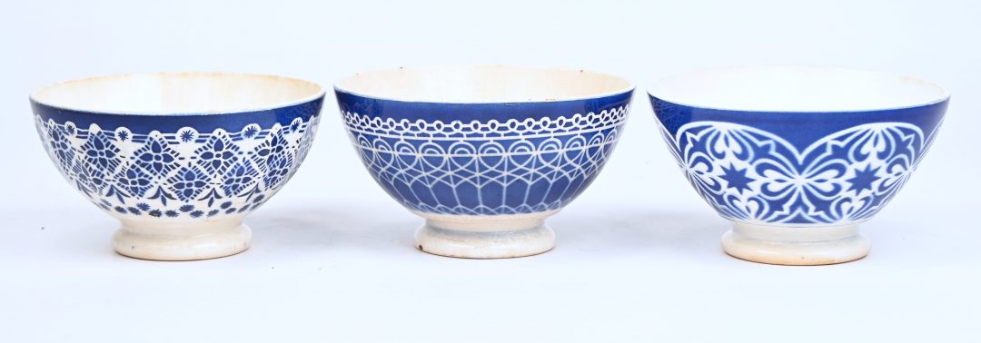 Drie kommetjes van blauw wit geglazuurd aardewerk. Eén is gemarkeerd Sarregueminnes.