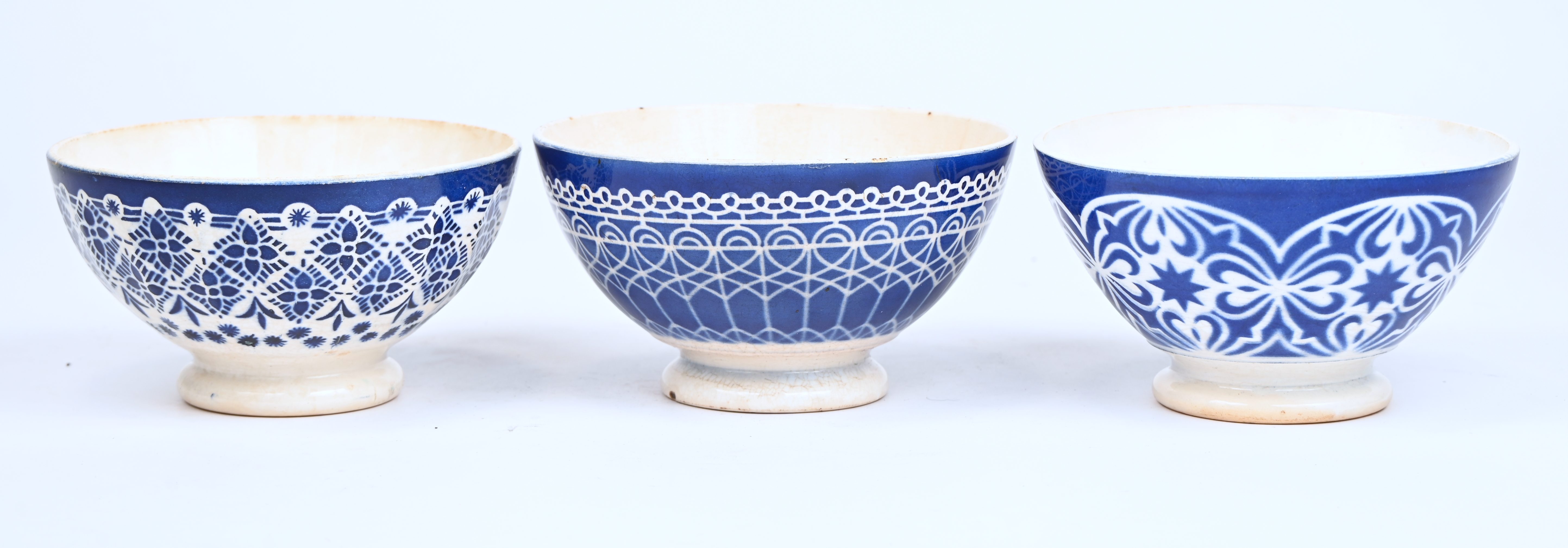 Three small bowls of blue and white glazed earthenware. One is marked Sarregueminnes.