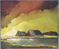 #222“Hoevezicht bij avondrood”, een schilderij, olieverf op paneel, niet gesigneerd.