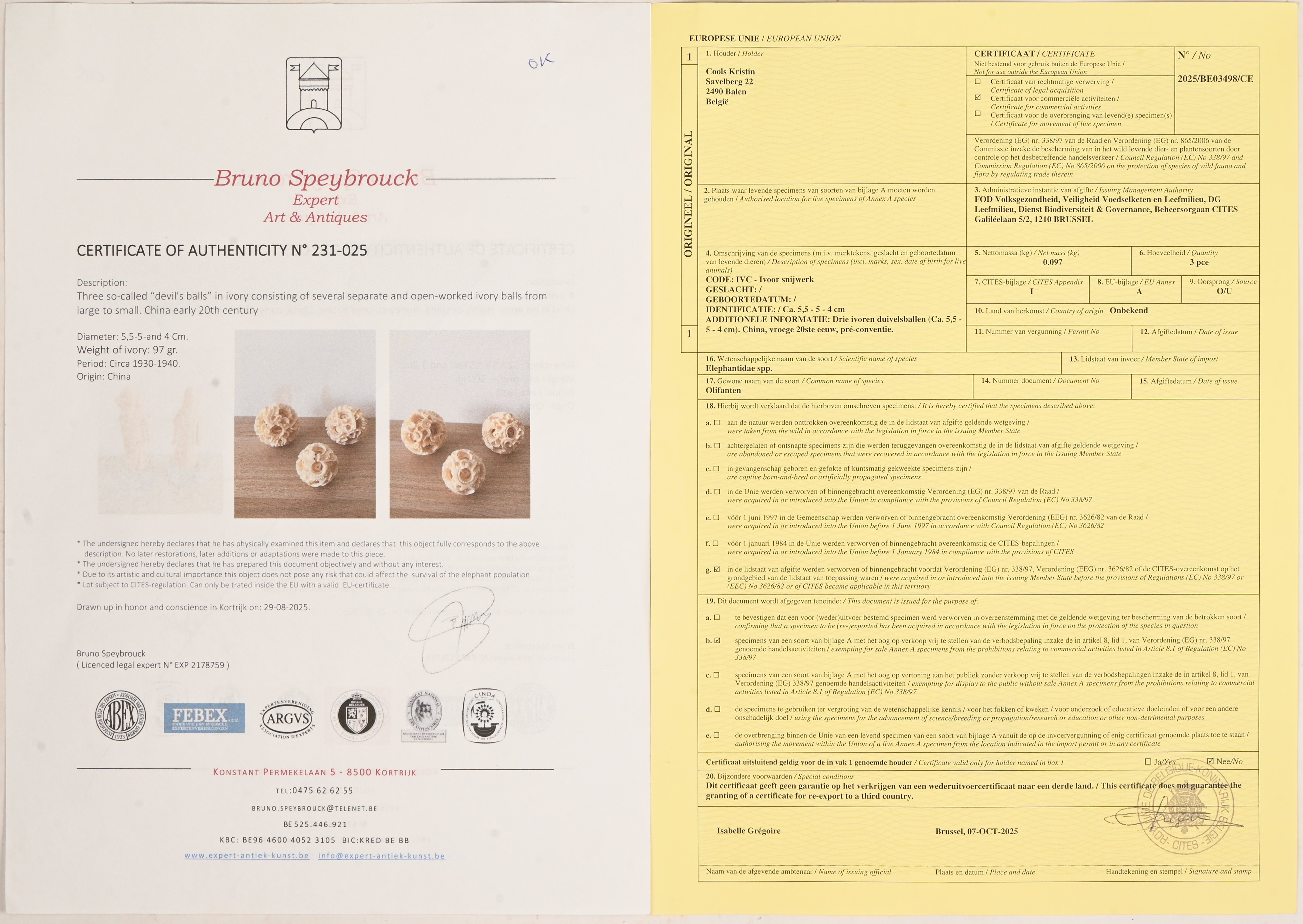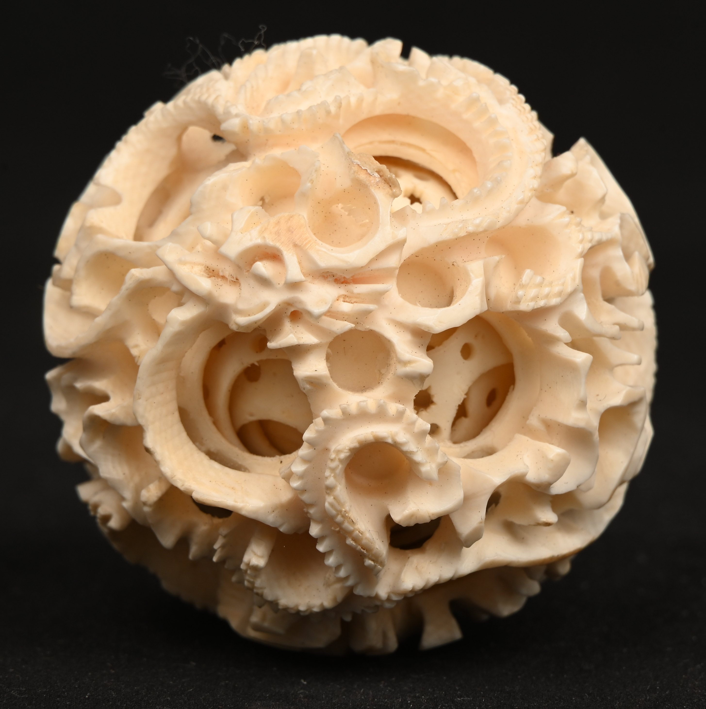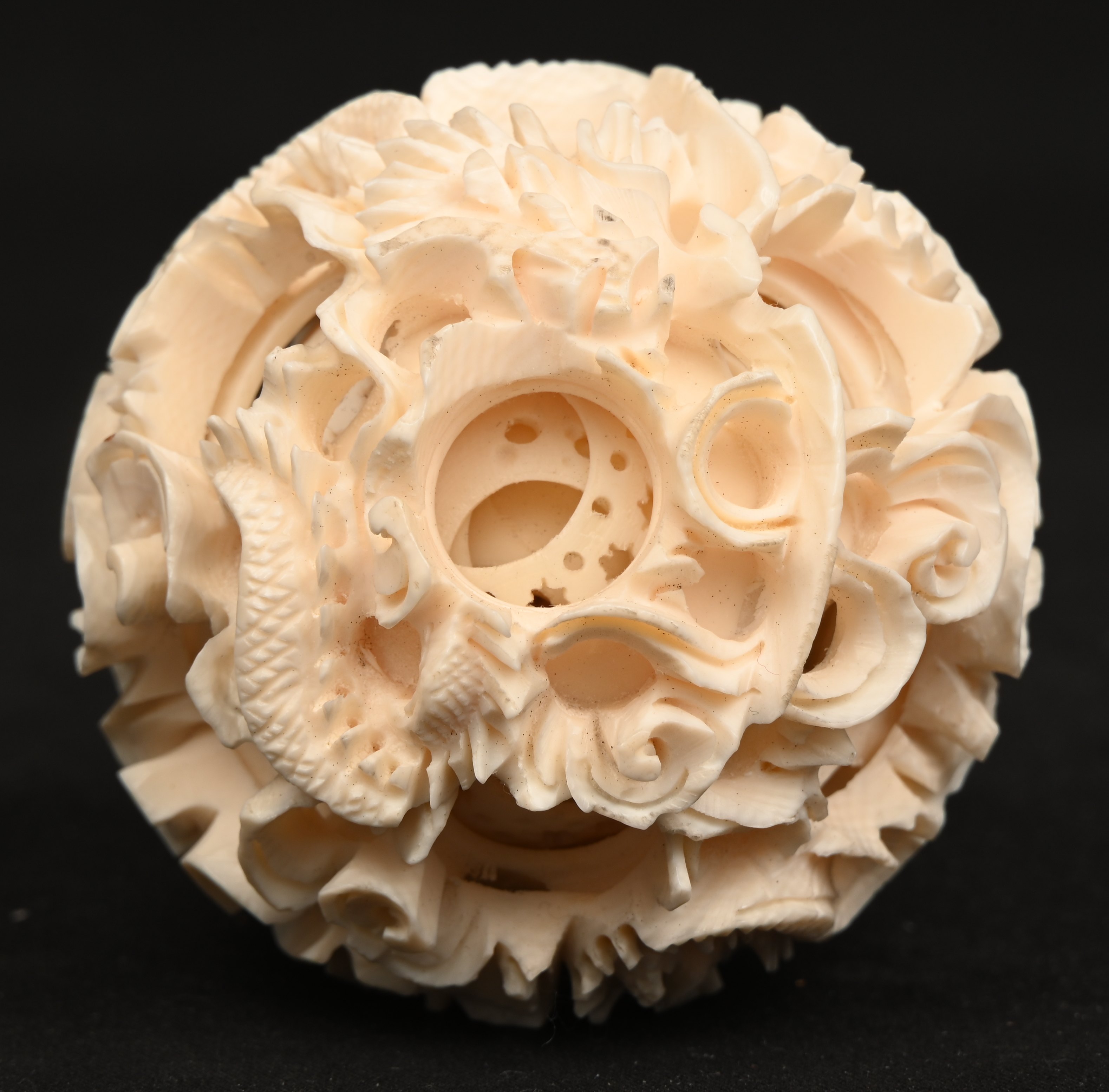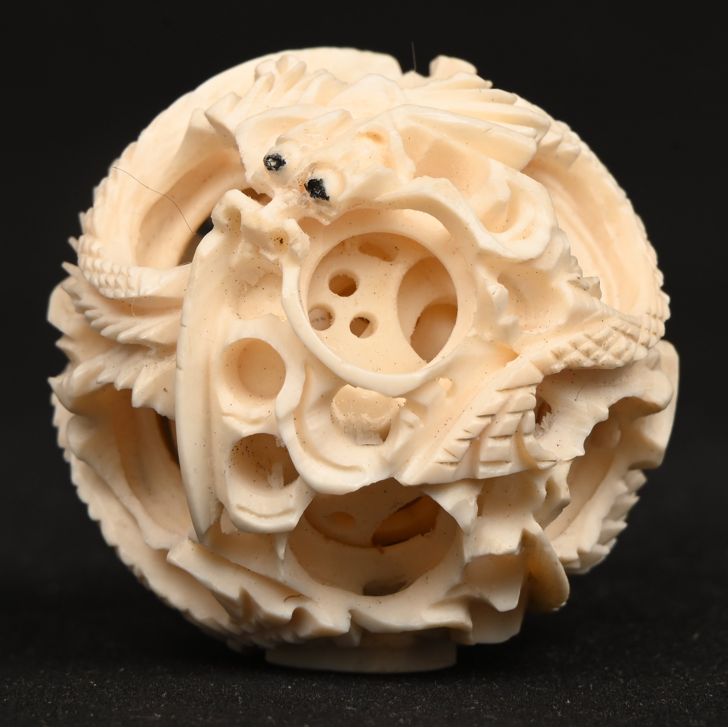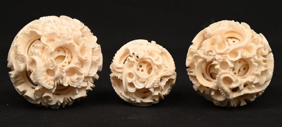 Drie magische ballen van ivoor, bestaande uit concentrische, ajourgewerkte bollen. Chinees werk. Met Citesattest.