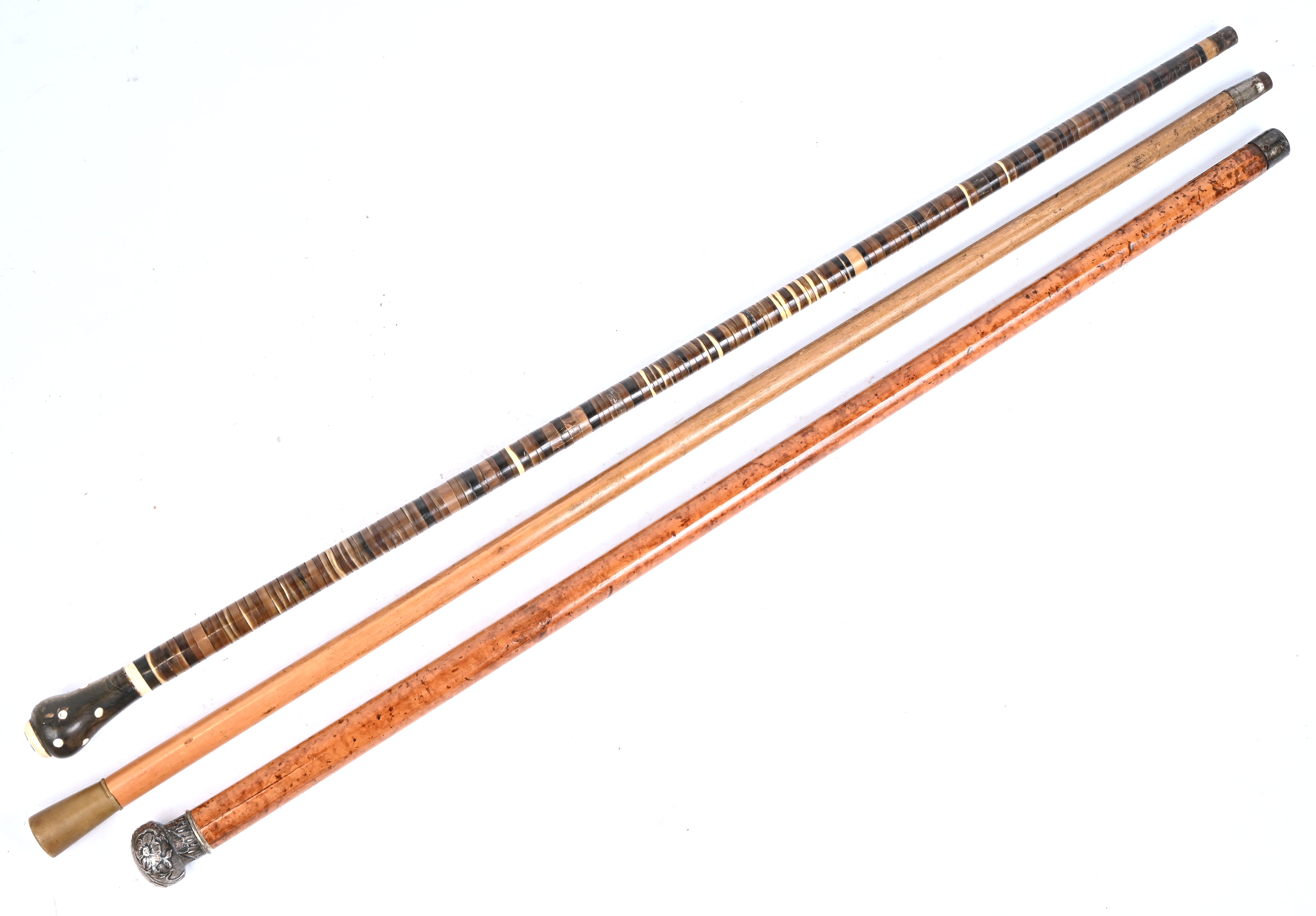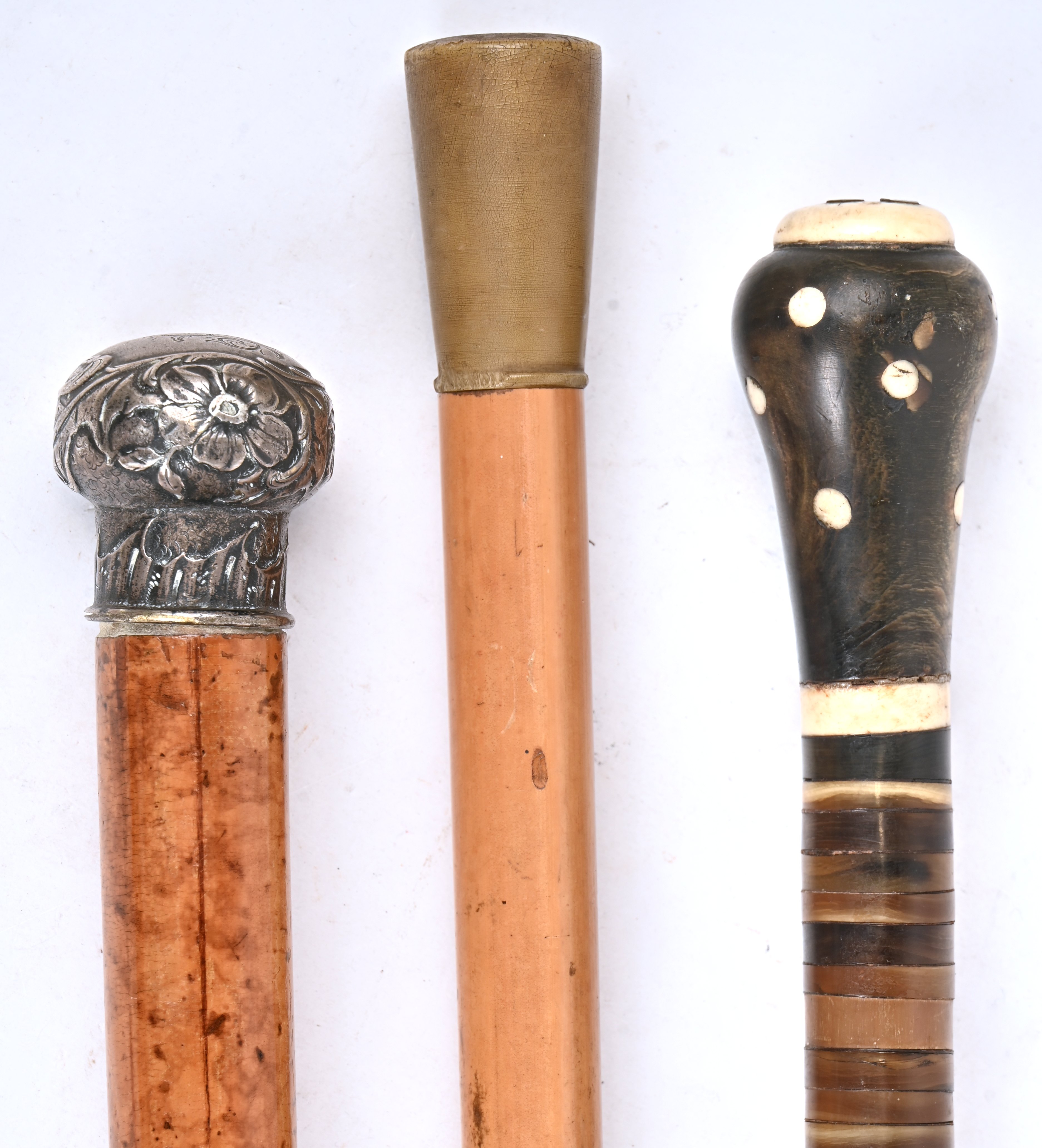 #267Een lot oude wandelstokken met koppen in diverse materialen: leder, hoorn, kunststof (hondekop), toegevoegd een wandelstok met paraplu (schade a/d stof) en een parasolletje.
