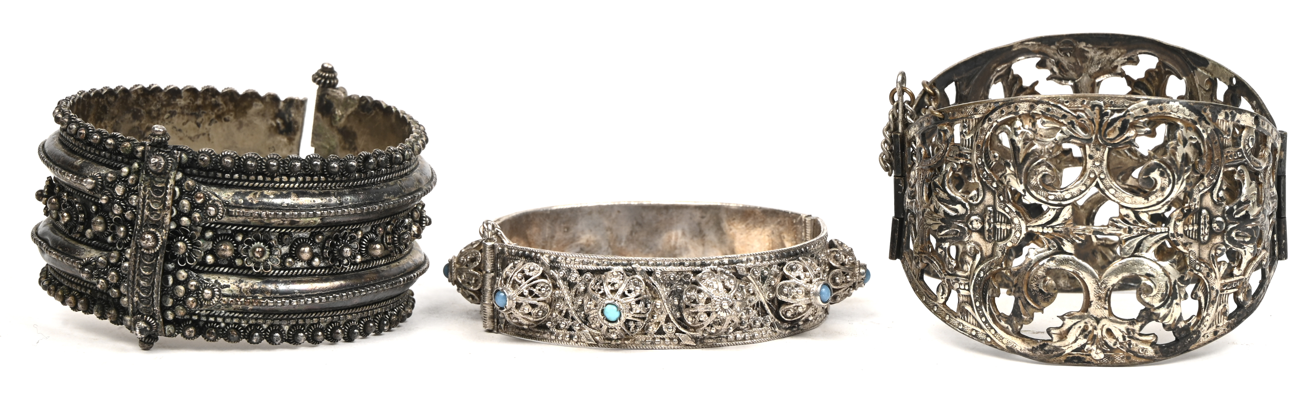 Vier verschillende zilveren spelden bezet met markasiet waarvan 1 waarvan enkele steentjes ontbreken.