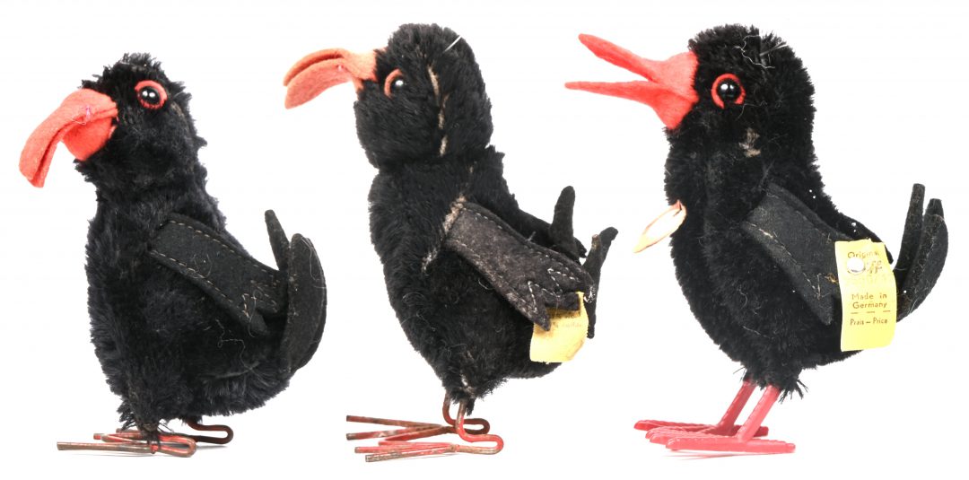 Drie vintage pluche hanen, gemerkt Steiff, één niet (meer) gemerkt.